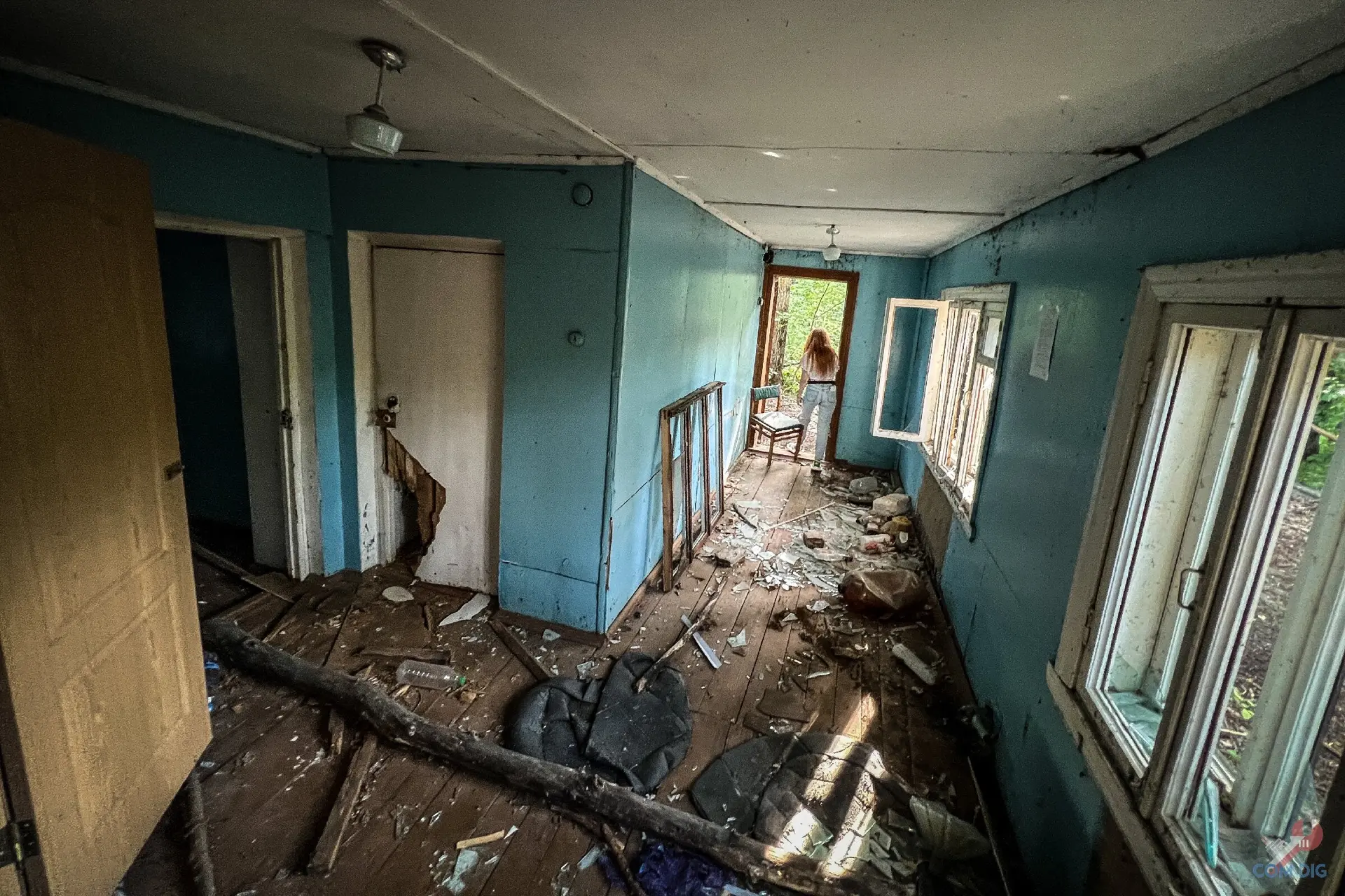 Сейчас все дома здесь разграблены до основания, сняты даже полы. А вот магазин едва заметен с дороги, поэтому мы решили заглянуть. Вдруг волна мародёрства обошла его стороной? Внутри нас ждала почти полная пустота. Ни намёка на прежний ассортимент, никаких этикеток или товаров. Сохранилась лишь массивная холодильная витрина, одиноко стоящая в просторном зале.