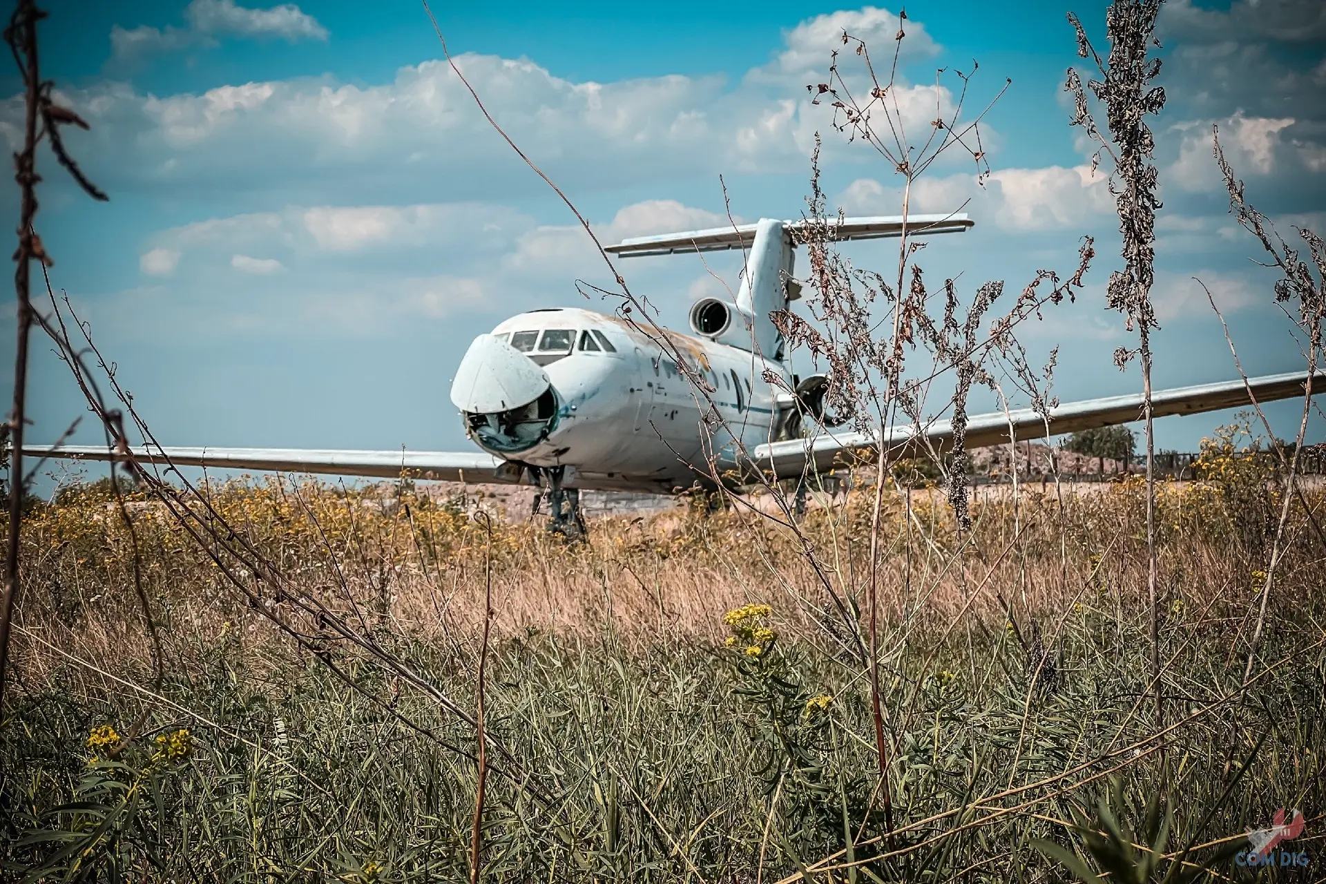 В Мариуполе, на улице Таганрогской, посреди поля одиноко стоит заброшенный пассажирский самолёт Як-40.