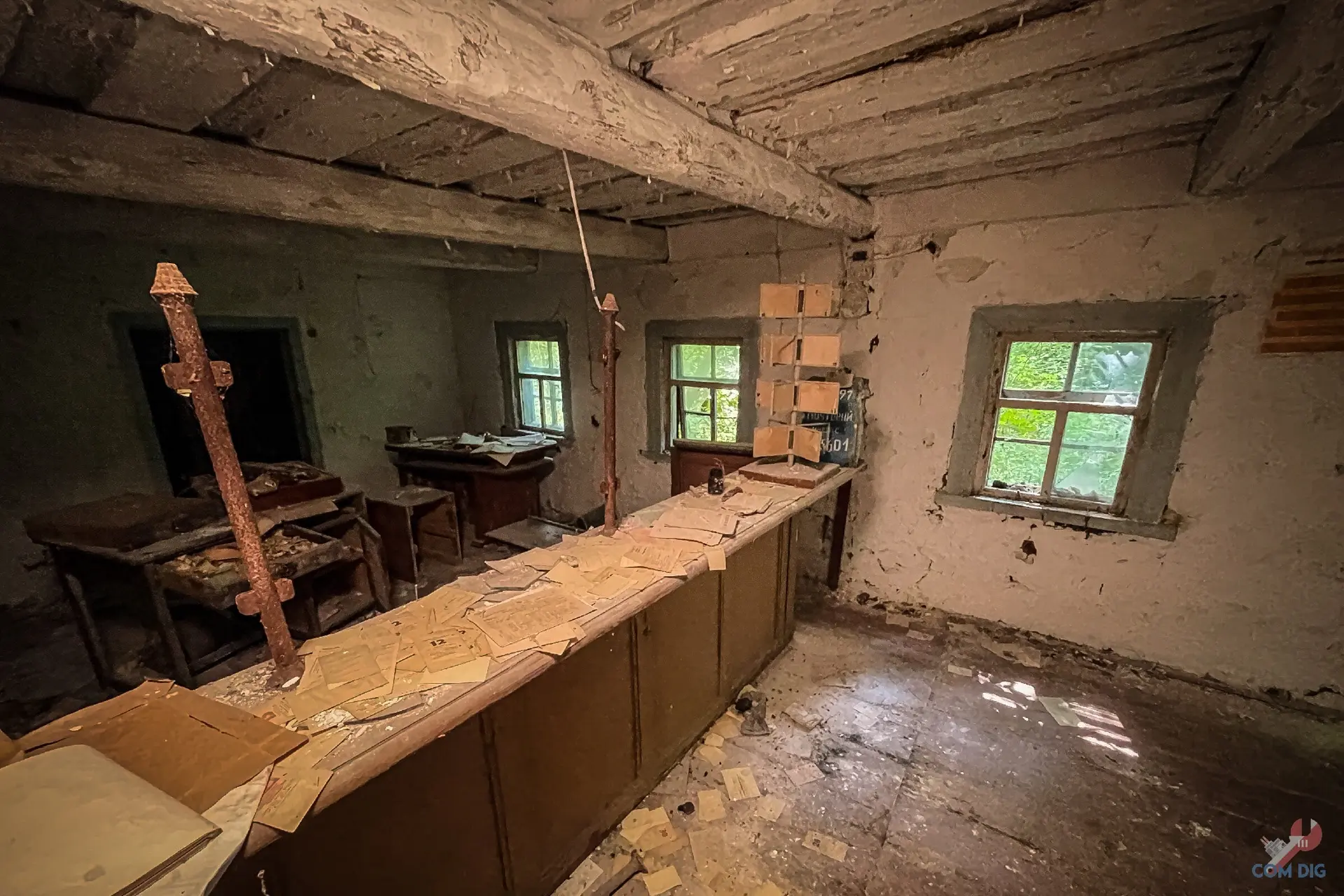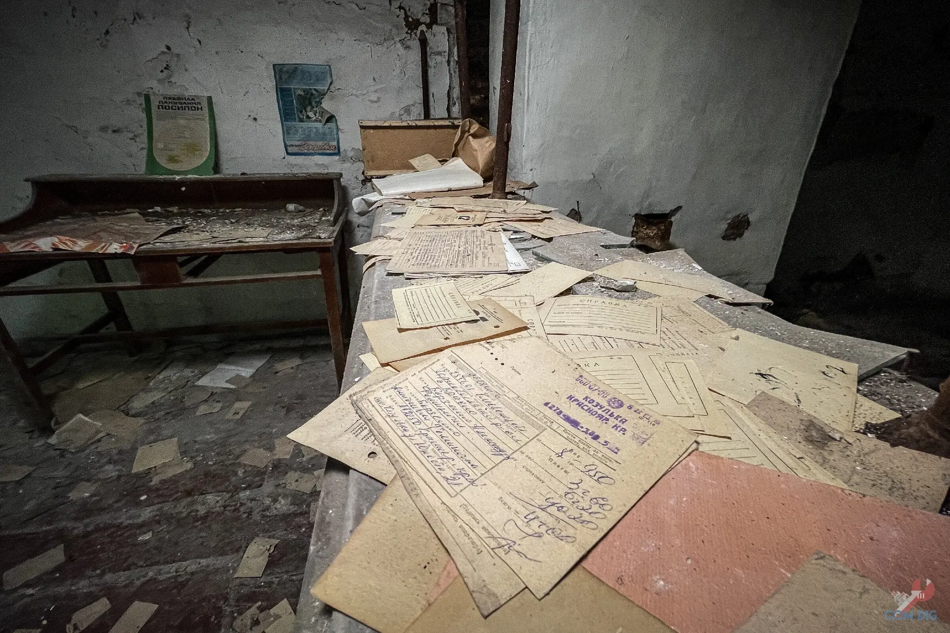 Внутри беспорядок. На полу кипы советских почтовых квитанций, а на стойке, ящик с индексом, рассыпанные извещения, открытки и письма. Многие из этих писем так и не дошли до адресатов, оставшись здесь навсегда.