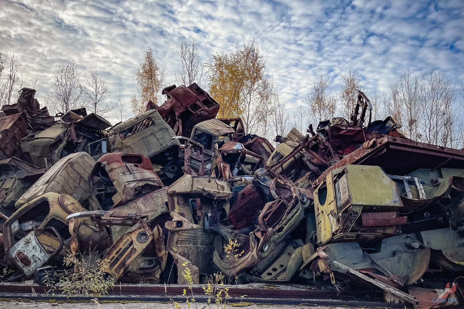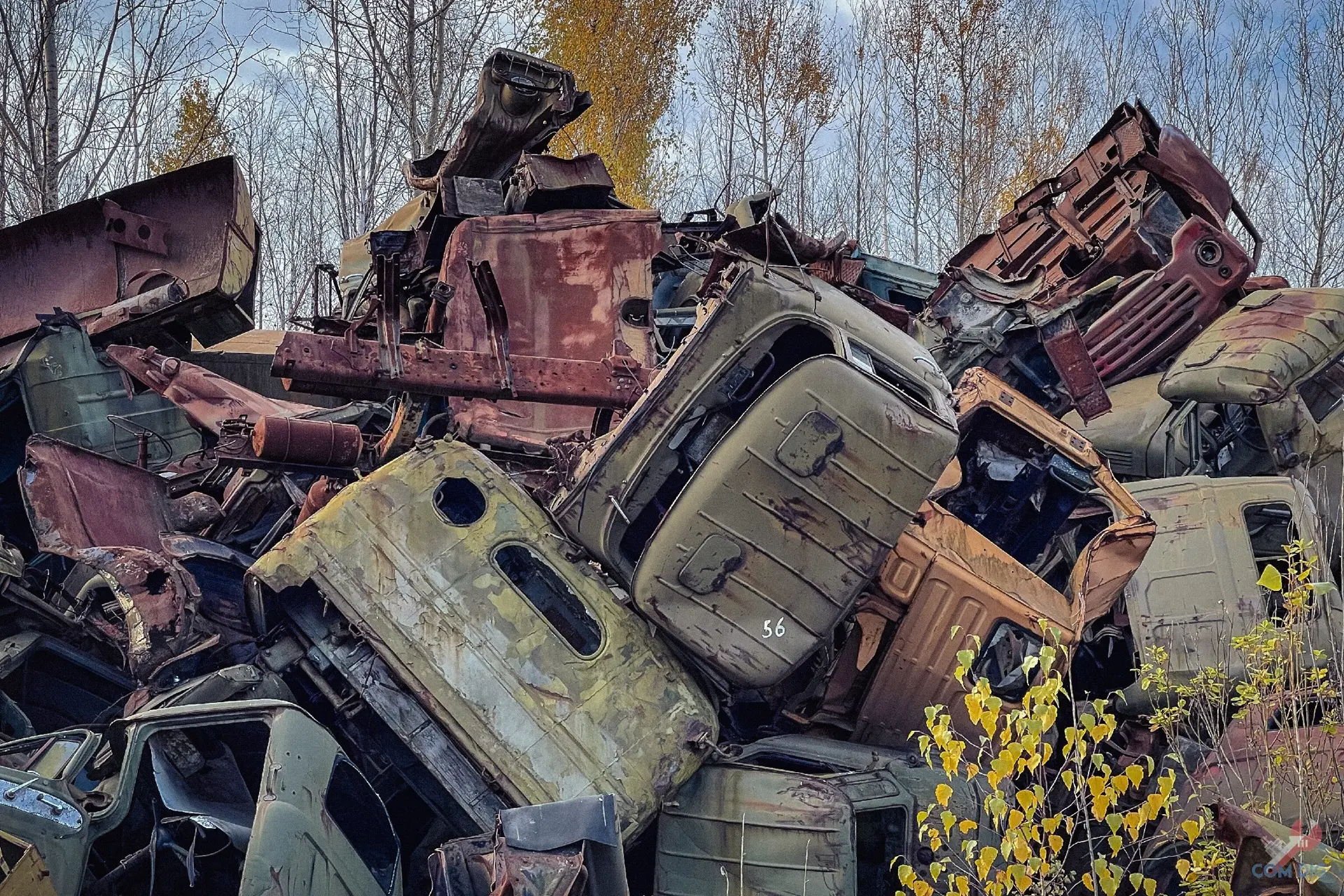 База по разделке техники продолжает работать до сих пор. Горы металлолома, распиленные бронетранспортеры, грузовики и цистерны лежат под открытым небом, напоминая о масштабах работ по ликвидации последствий катастрофы.