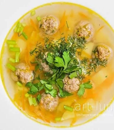 Нарезать картофель кубиками. Нарезанный картофель промыть. Натереть морковь на крупной терке. Лук нарезаем мелко. Болгарский перец нарезать соломкой. Воду довести до кипения, и отправить туда все нарезанные ингредиенты кроме картофеля. Газ убавить и варить суп при слабом кипении от 5 до 7 минут. Затем опускаем в кастрюлю картофель и довести до кипения. Из фарша катаем маленькие шарики и опускаем их в суп. Солим, перчим по вкусу. Затем немного убавляем огонь и варим 12-15 минут при слабом кипении. При желании можно добавить горсть риса. В конце варки добавить лавровый лист, выключить огонь и дать настояться.