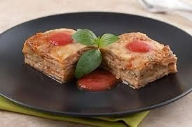 Отчистить баклажаны от коды, нарезать вдоль тонкими пластинами толщиной 3 мм. Посолить с двух сторон, подождать 10 минут до выделения горечи и промокнуть бумажной салфеткой. Взбить яйцо венчиком, обвалять пластины баклажана в муке, обмакнуть во взбитое яйцо и обжарить с двух сторон на оливковом масле до золотистой корочки. Натереть сыр моцарелла и пармезан на терке, смешать сыры. В томаты в собственном соку добавить соль и перец, специи, зубчик чеснока и измельчить в блендере. Выложить баклажаны слоями в глубокий латок, промазать тонкими слоями томатного соуса и сыра, запекать в духовке при температуре 180 градусов 40 минут. Разрезать содержимое лотка на 2 части и выложить на тарелку, полить остатками соуса и подавать, украсив веточкой мяты.