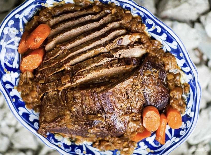 Посыпать грудинку с обеих сторон солью, и перцем, слегка пропылить мукой. Разогреть масло в сковороде и обжарить мясо по 7 минут с всех сторон. Когда мясо будет золотисто, коричневого цвета, достать его. На этом мясном соку тушить мелко нарезанный лук 15 минут. Вернуть мясо обратно, обмазав его томатной пастой. Вокруг выкладываем очищенную морковь и чеснок. Накрыть все фольгой и в духовку разогретую до 180 градусов готовить в течении полутора часов. Режим на кусочки, посыпаем петрушкой.