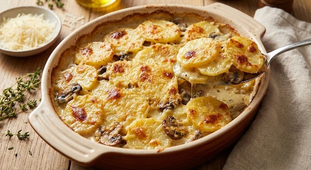 Форму размером (20х30 см) Хорошо смазать сливочным маслом. В сливки добавить соль, перец, мускатный орех, перемешать. Поставить на плиту, довести до кипения и убрать с плиты. Картофель вымыть и нарезать тонкими пластинами. Удобно это делать с помощью специальной терки для нарезки овощей. Выложить первый слой картофеля в смазанную форму. Выкладывать пластины картофеля немного внахлест друг на друга. Посыпать картофель 0,25 частью тертого сыра и залить первый слой 0,25 частью сливок. Повторить с оставшимся картофелем, сыром и сливками. Если есть грибы, можно добавить слой грибов. Вылить оставшийся сливки на картофель. Сыр на верхний слой не выкладывать. Запекать в разогретой духовке при температуре 150 градусов примерно час. Чтобы картофель сох и быстрее приготовился, накрыть форму фольгой. Через час фольгу снять, проверить готовность картофеля ножом. Если картофель готов, то достать противень с гратеном из духовки и посыпать сыром. Поставить форму в духовку на несколько минут, до расплавления сыра и появления корочки. Оставить блюдо на 10-15 минут, чтобы чуть остыло и подавать на стол.