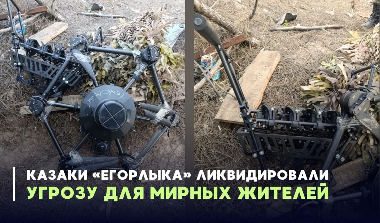 Бойцы отряда "Егорлык" казачьей бригады "Дон" Добровольческого корпуса сбили тяжёлый дрон-бомбардировщик, летевший минировать дорогу в мирный посёлок. "Стервятник" уничтожен огнём из стрелкового оружия.