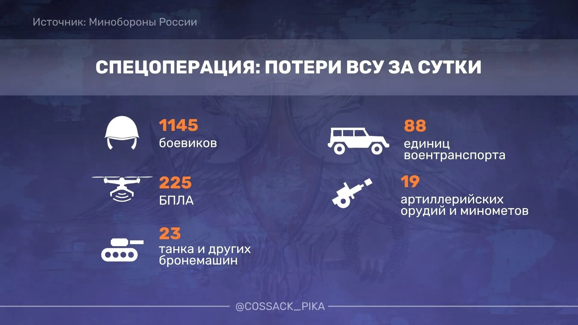 Противник делает ставку на дроны, пытаясь сковать наши действия. Бои продолжаются на прежних рубежах, враг контратакует, но без успеха. Группировка «Юг» отработала по скоплениям бандеровцев в Константиновке, Ильиновке (Ильича), Николаевке и Артеме. Потери хохлов: до 195 человек, семь бронемашин, 22 автомобиля, четыре орудия, две станции РЭБ «Буковель», два склада БК и семь складов матчасти. Враг пытается удержать город любой ценой, но наша авиация и артиллерия методично перемалывают его резервы.