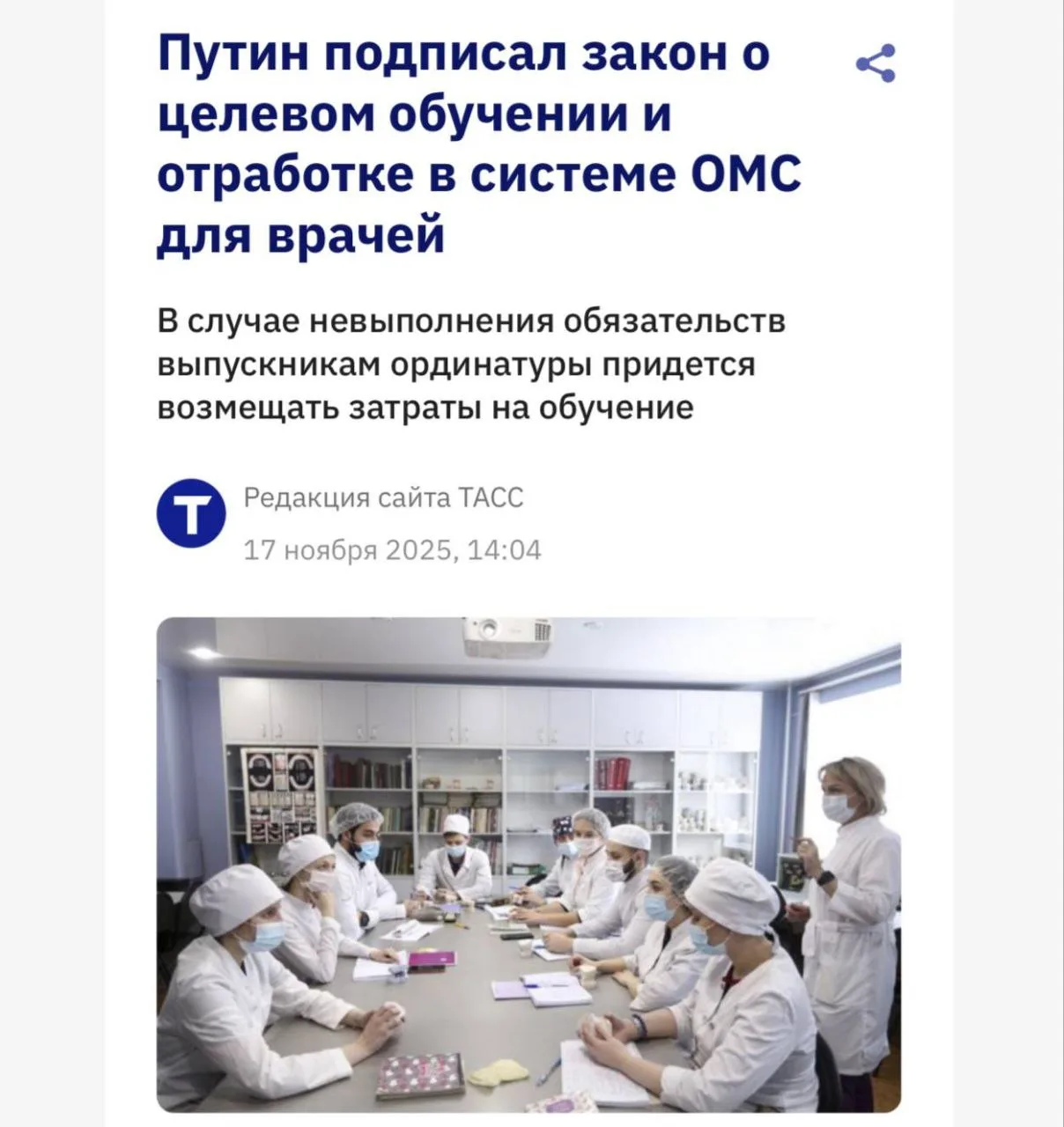 ⚡️С 1 марта студенты медвузов обязаны будут отрабатывать минимум 3 года в больницах с ОМС. Все бюджетные места станут целевыми.