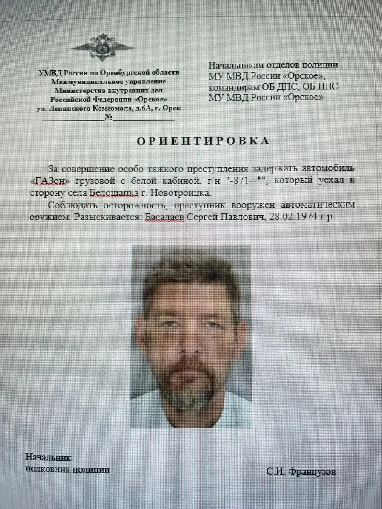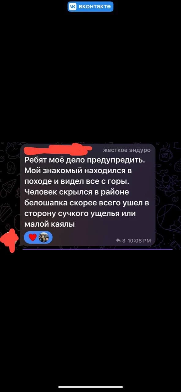 Убедительная просьба!!! Ограничить своё посещение территорий Губерли, Белошапки, Хабарного, Старой Губерли. Подозреваемый может быть вооружен автоматическим огнестрельным оружием. И ни в коем случае не предпринимать самостоятельных попыток задержания.