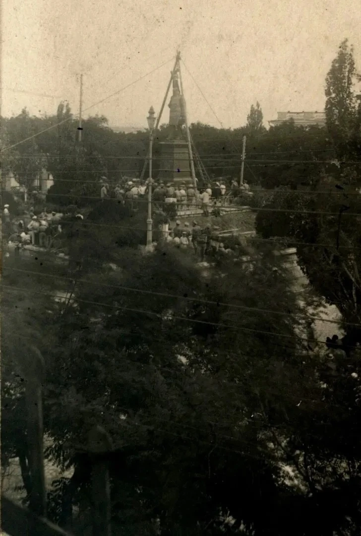 4 июля (21 июня) 1917 г. В Феодосии явочным порядком без согласования с городскими властями толпой под руководством Совета рабочих и солдатских депутатов снят с постамента памятник Александру III.