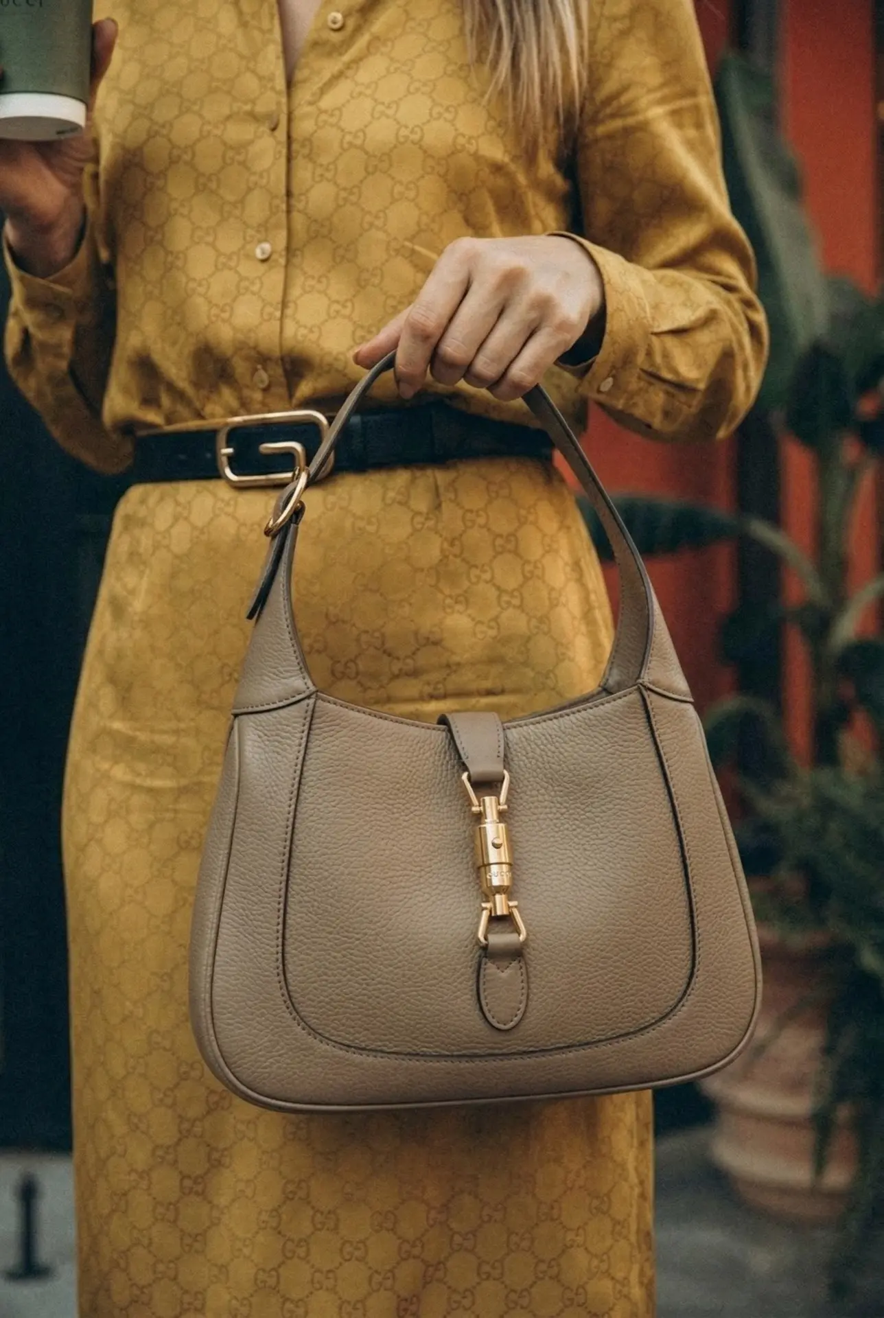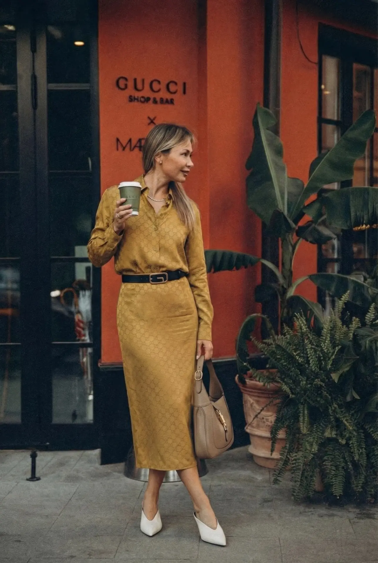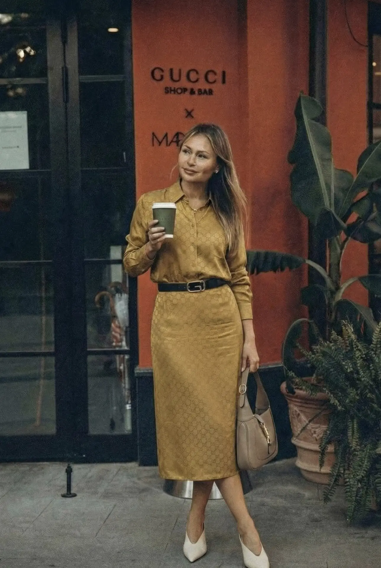 Тот самый тёплый жёлтый, монограмма, чёткий силуэт и ремень, который собирает образ в «дорого и спокойно». А сумка в серо-песочном цвете - идеальный баланс: мягкая форма, правильная фурнитура, и она не спорит с принтом, а поддерживает его.