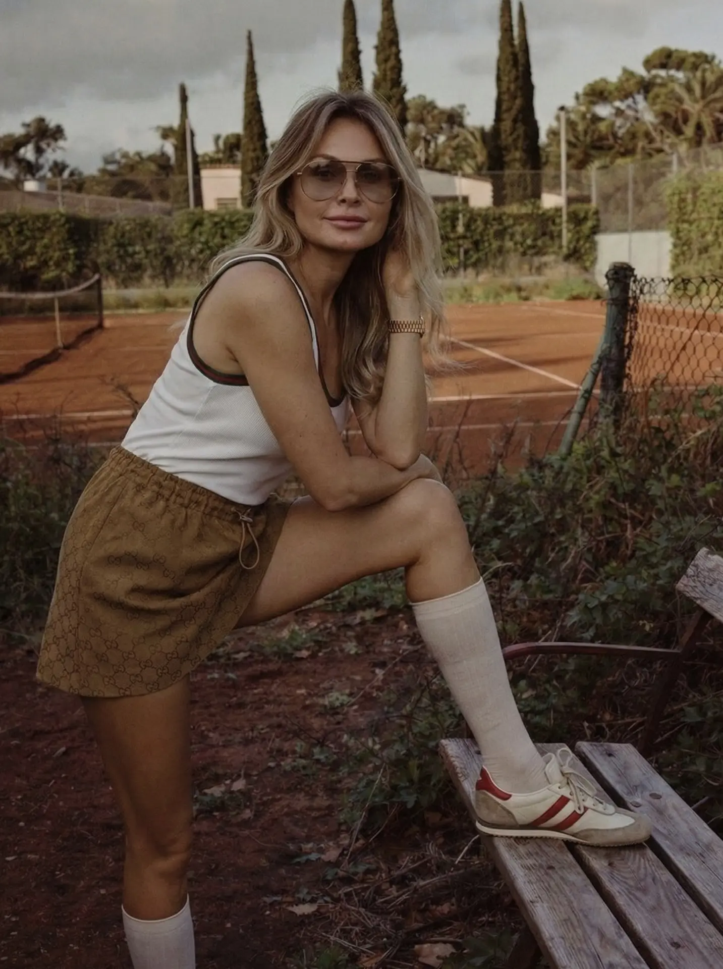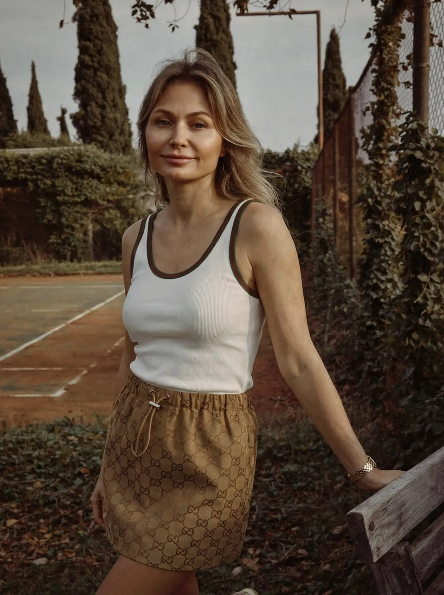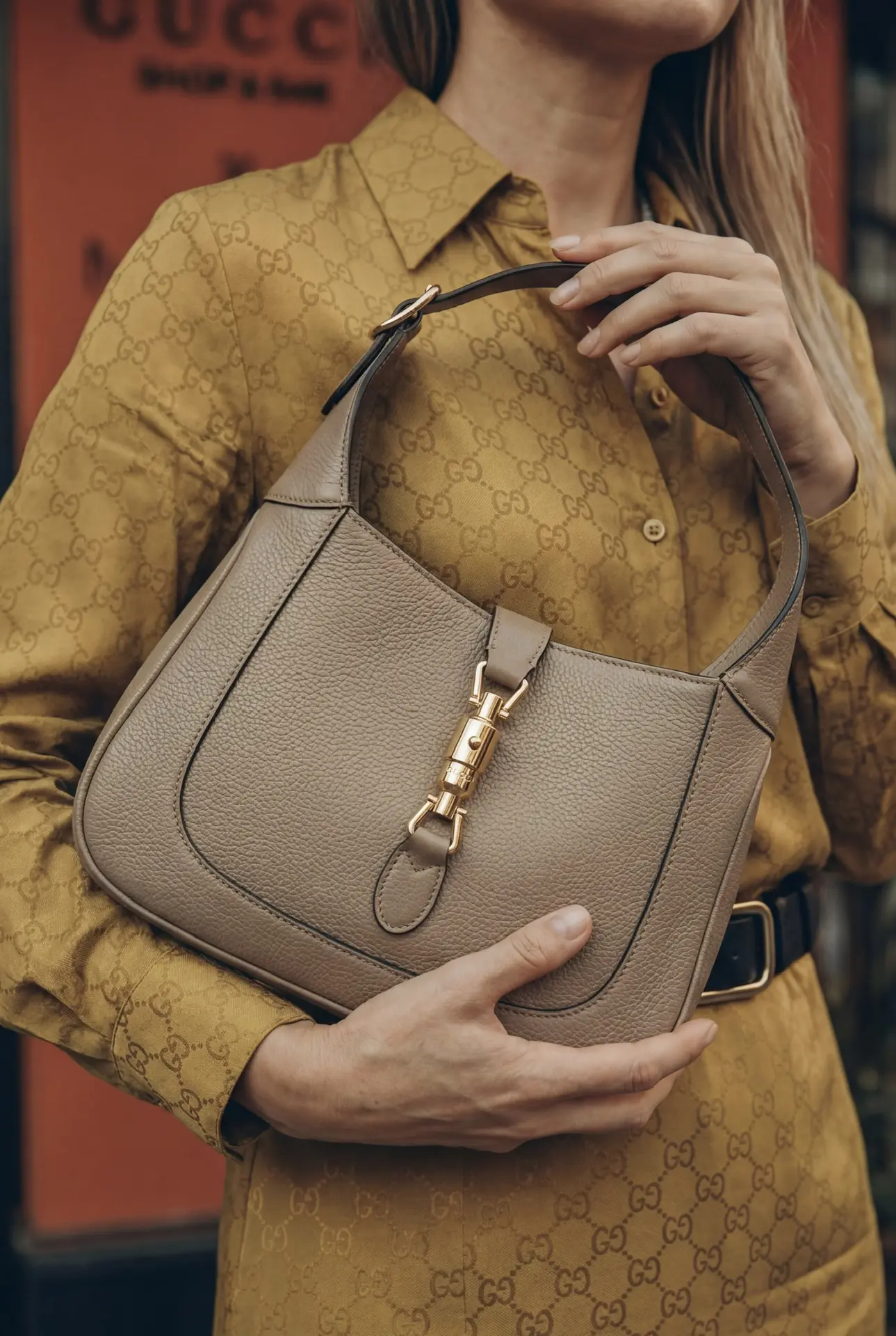 Тот самый тёплый жёлтый, монограмма, чёткий силуэт и ремень, который собирает образ в «дорого и спокойно». А сумка в серо-песочном цвете - идеальный баланс: мягкая форма, правильная фурнитура, и она не спорит с принтом, а поддерживает его.