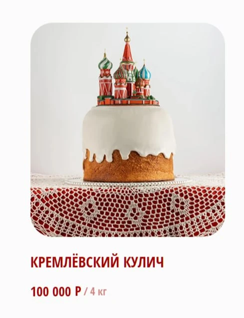 Нет, это не ошибка в цифре. В Москве разлетается "Кремлевский кулич" за 100 тысяч рублей - четыре кило теста с полностью съедобным храмом Василия Блаженного наверху. Есть "Матрешка" - в которой царский кулич, за 33 000 рублей. Подешевле есть "Жар-птица" за 30 000.