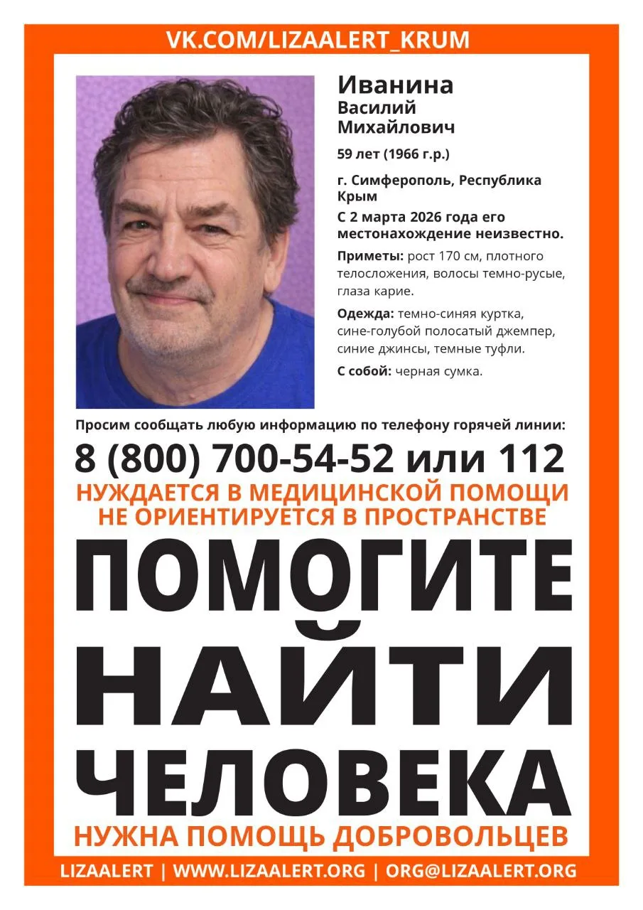 Помогите распространить информацию. Пропал человек, возраст 59 лет, рост 175-180см. Глаза карие. Был одет в темно-синюю балоневую куртку и темно-синие джинсы. Передвигается с палочкой.