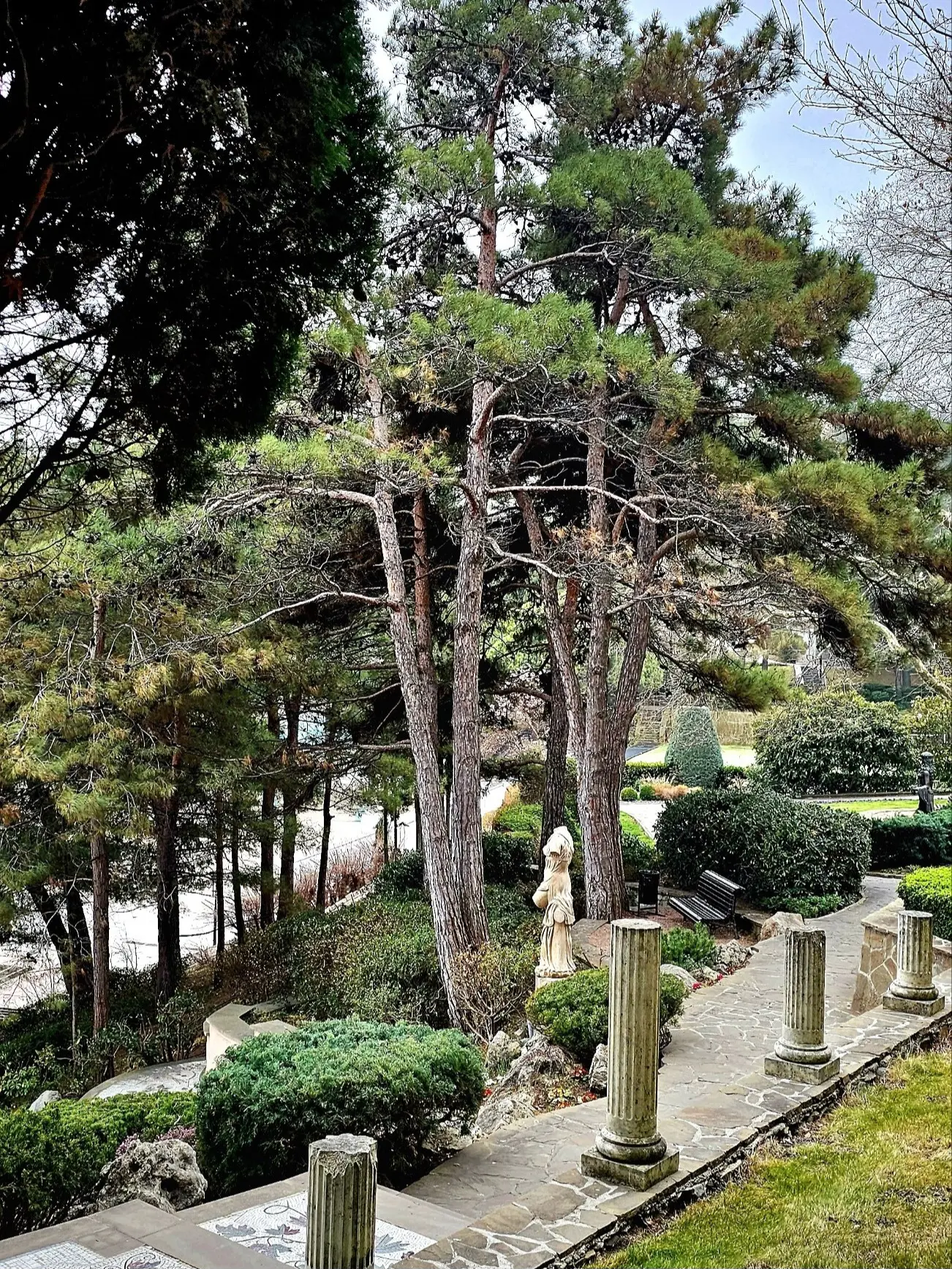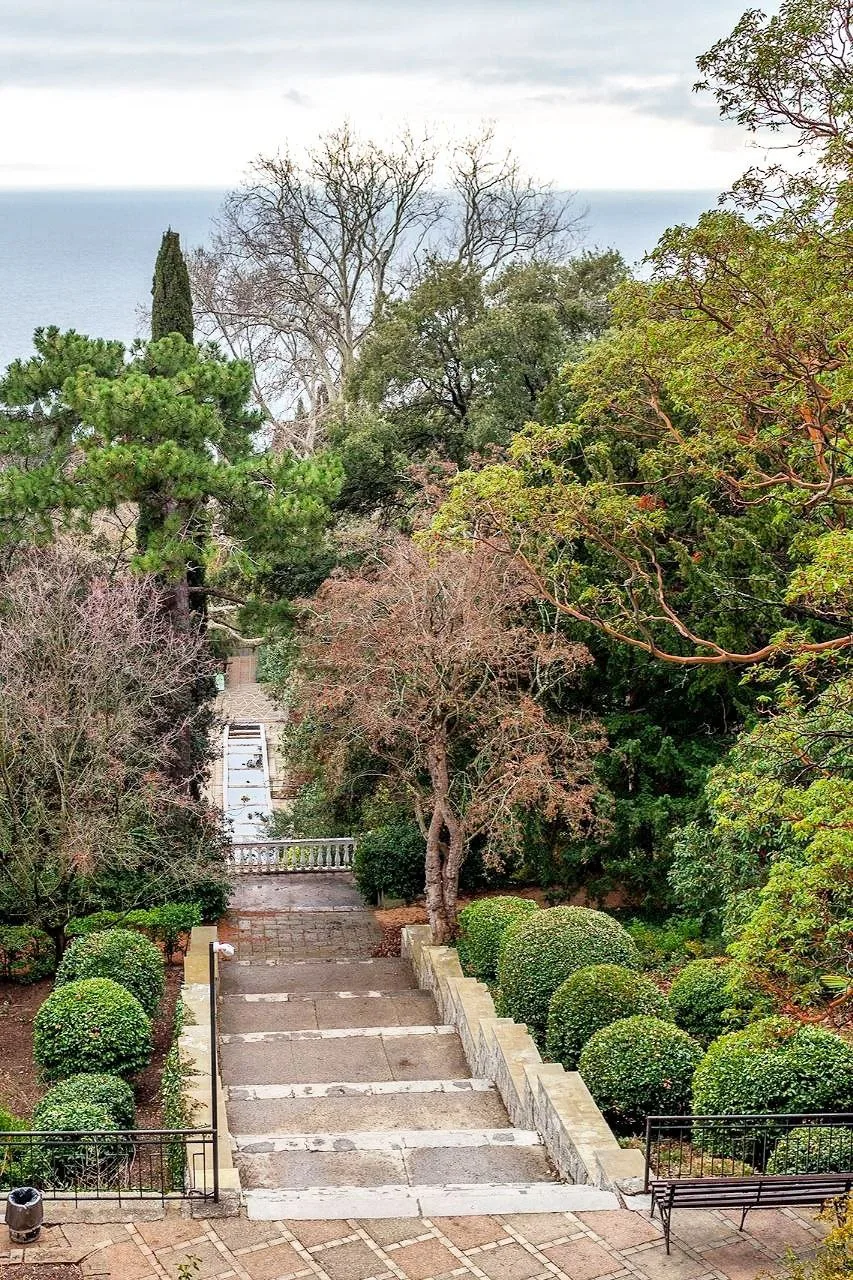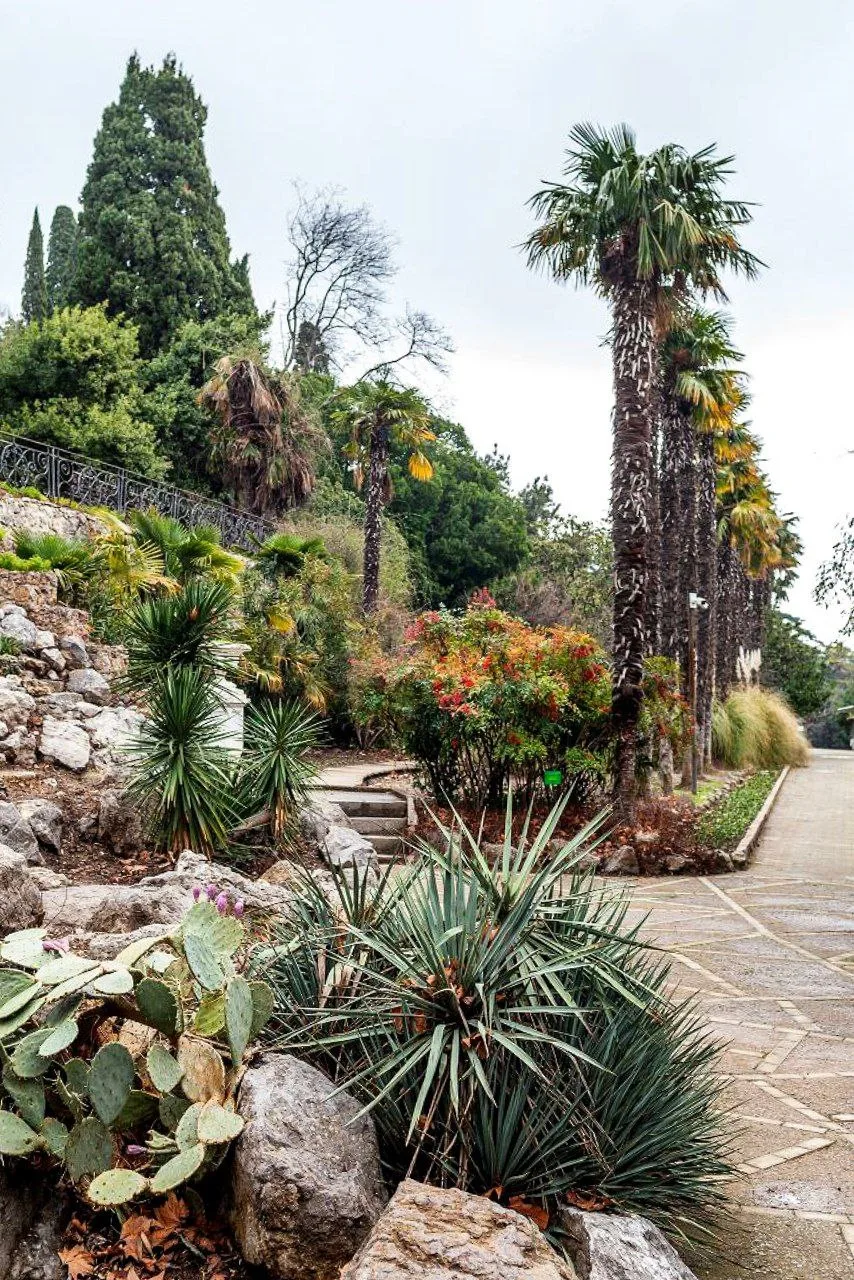 🌲 Жилые дома перемежаются с субтропической растениями, а спуск к морю и вовсе проходит сквозь старинный парк.