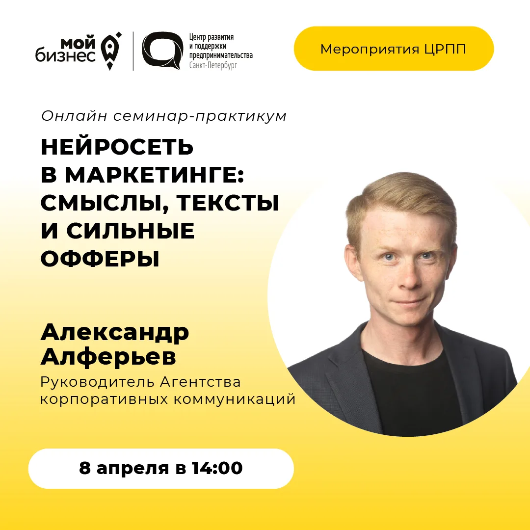 🔶 Центр «Мой бизнес» приглашает на онлайн-практикум «Нейросети в маркетинге: смыслы, тексты и сильные офферы»