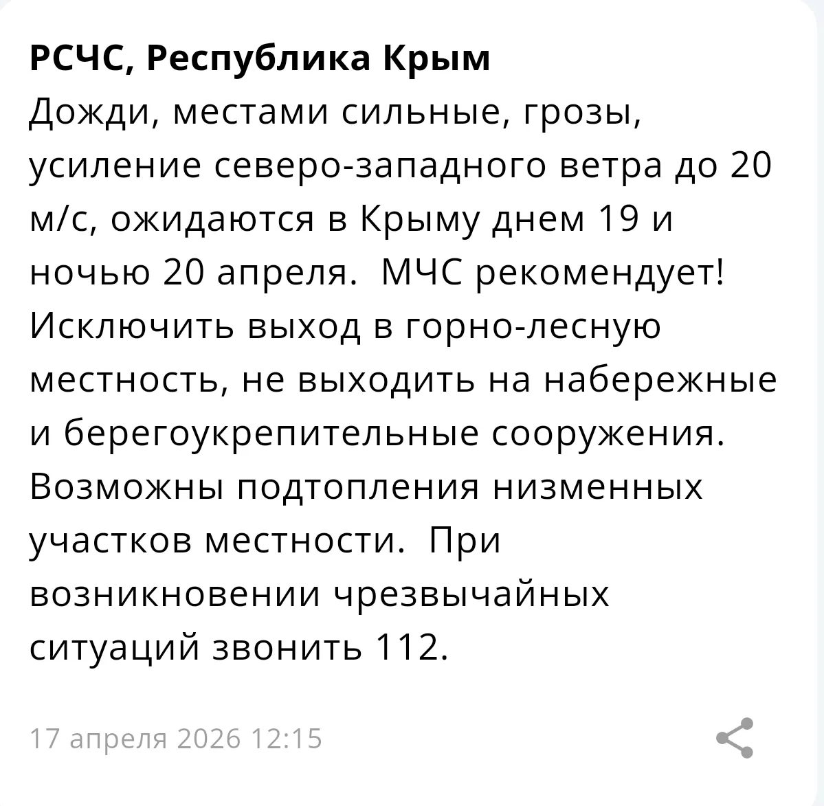 РСЧС: сильные дожди и грозы придут в Крым 19 и 20 апреля