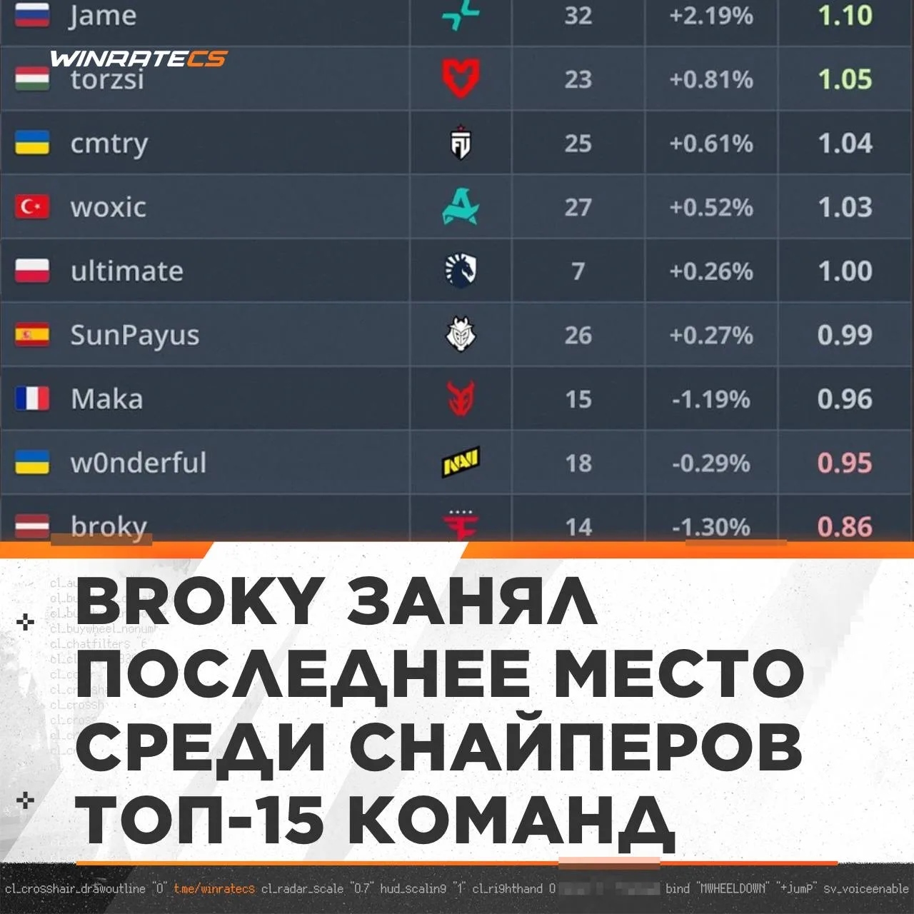 По последним данным broky занял последнее место среди снайперов топ-15 команд с рейтингом 0.86.