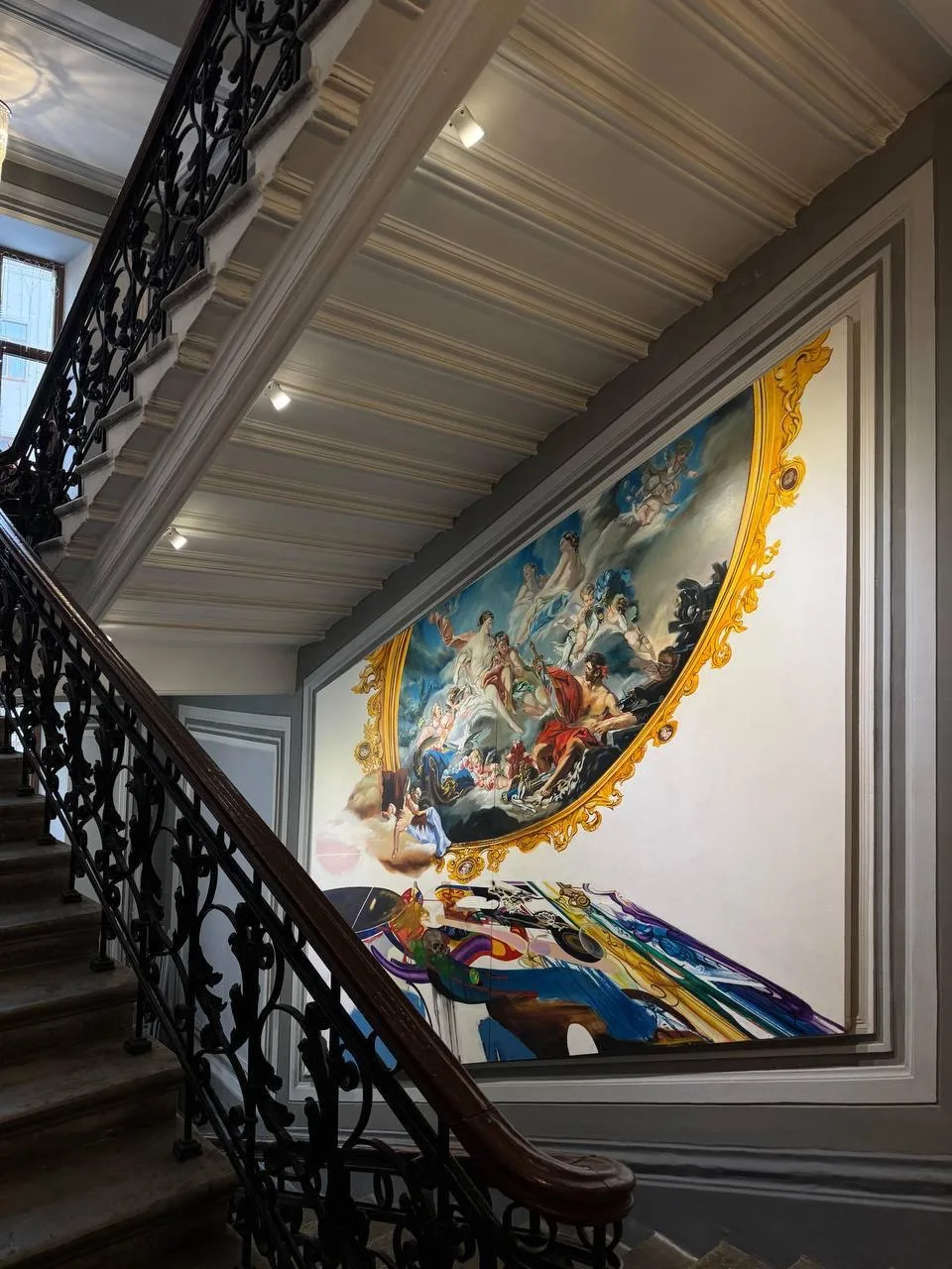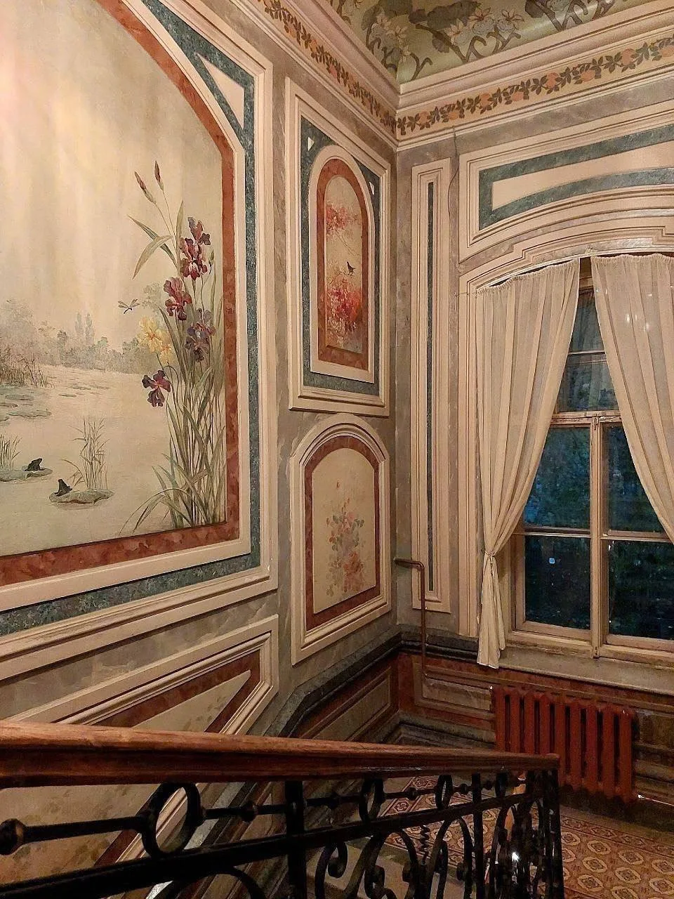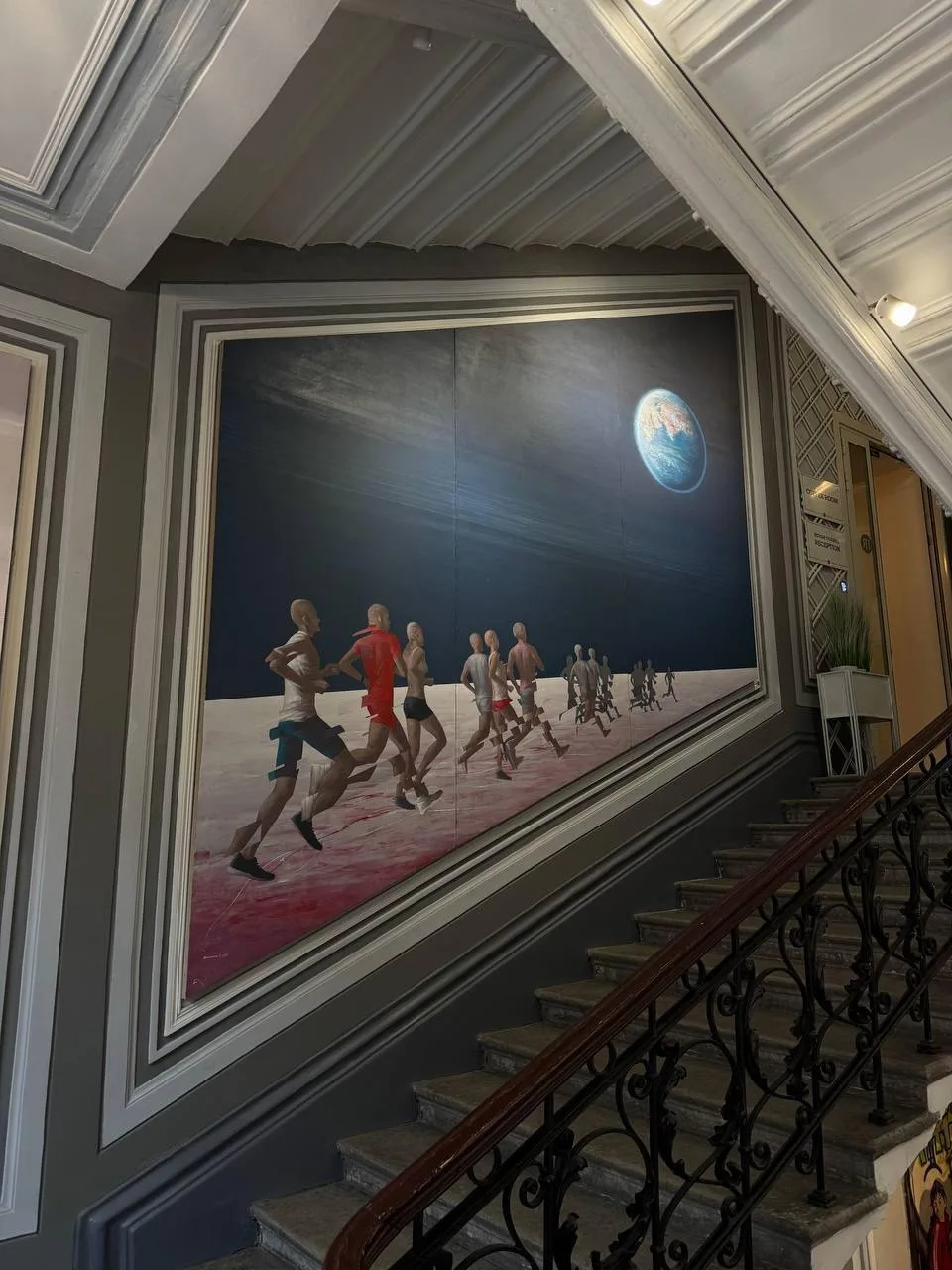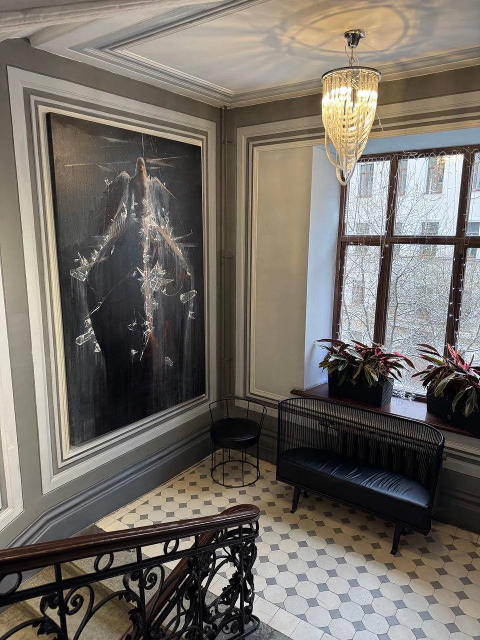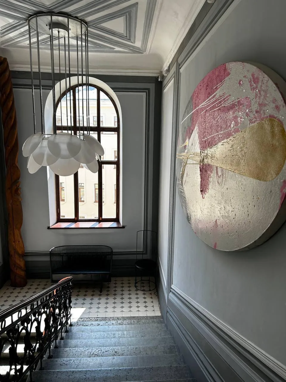 На стенах парадной лестницы — настоящие живописные полотна, не репродукции. Здесь хочется остановиться, рассмотреть детали и поймать ощущение, будто попал в маленький музей по пути домой.