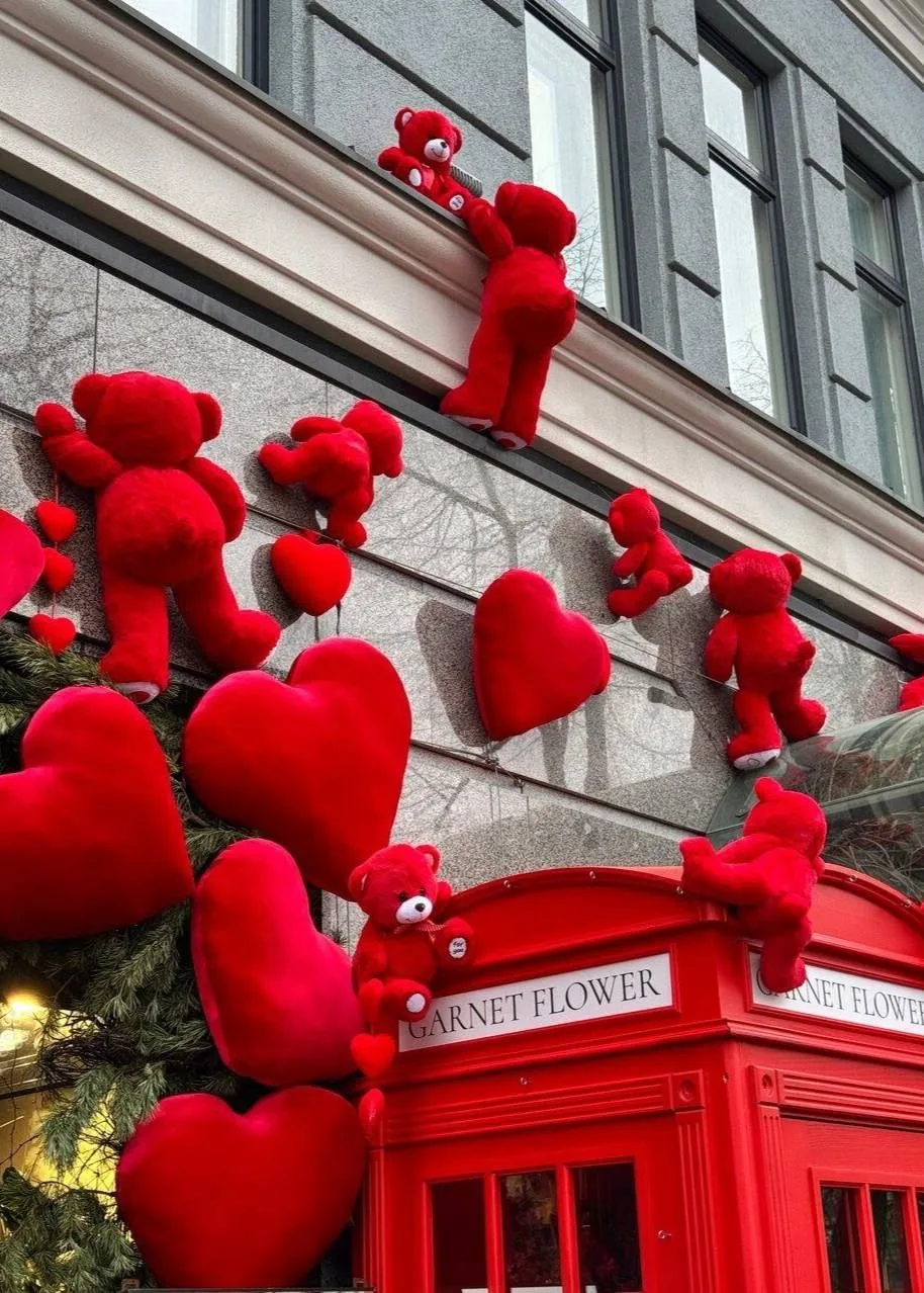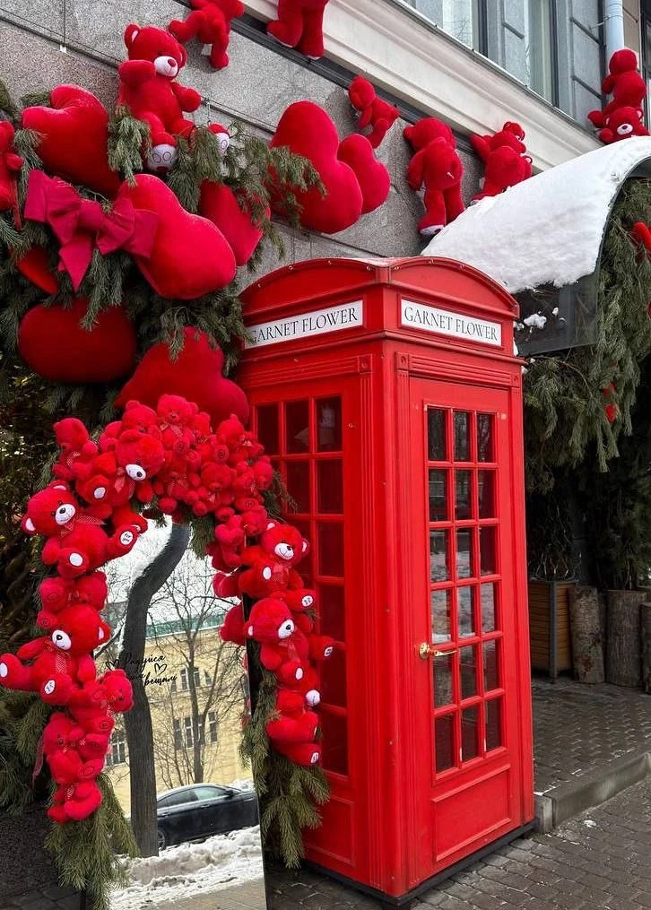 Недалеко от Геологоразведочного музея появилась яркая фотозона. Плюшевые мишки украсили фасад цветочного магазина и большое зеркало, а дополняют локацию романтичные сердечки и стильная телефонная будка — отличное место для фото.