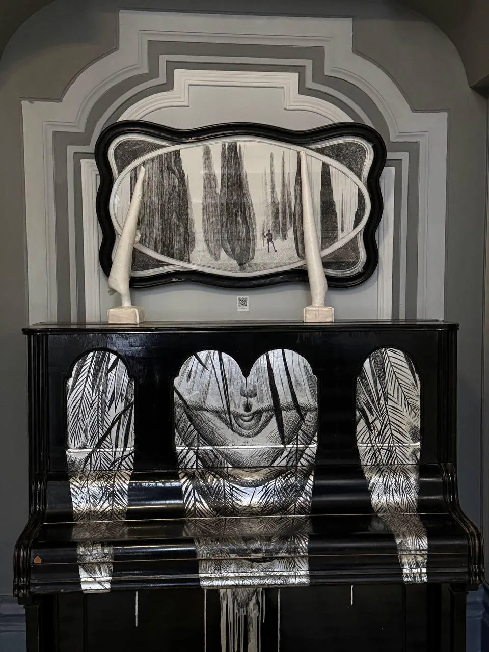 На каждом этаже — фортепиано, превращённые в арт-объекты: инструменты расписаны вручную, и у каждого — своя история.