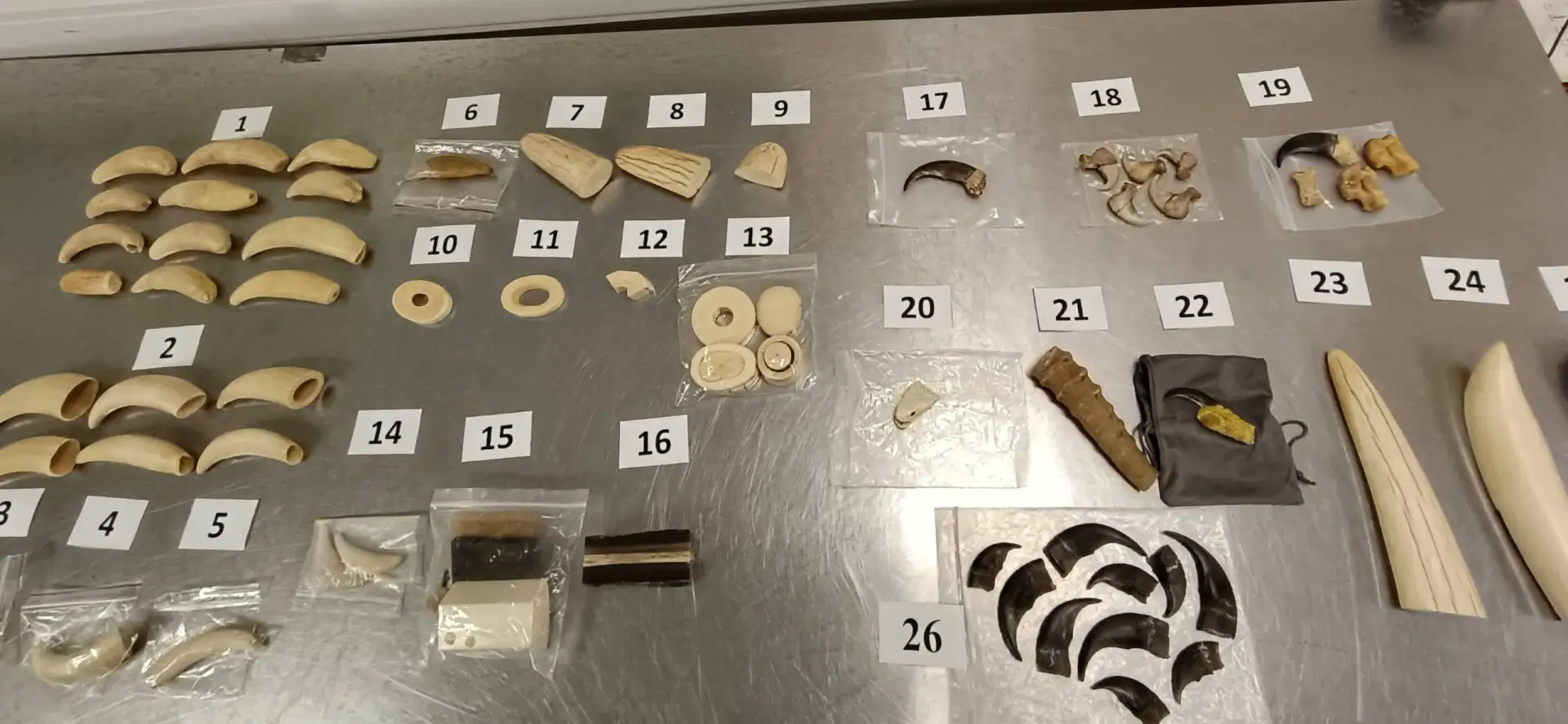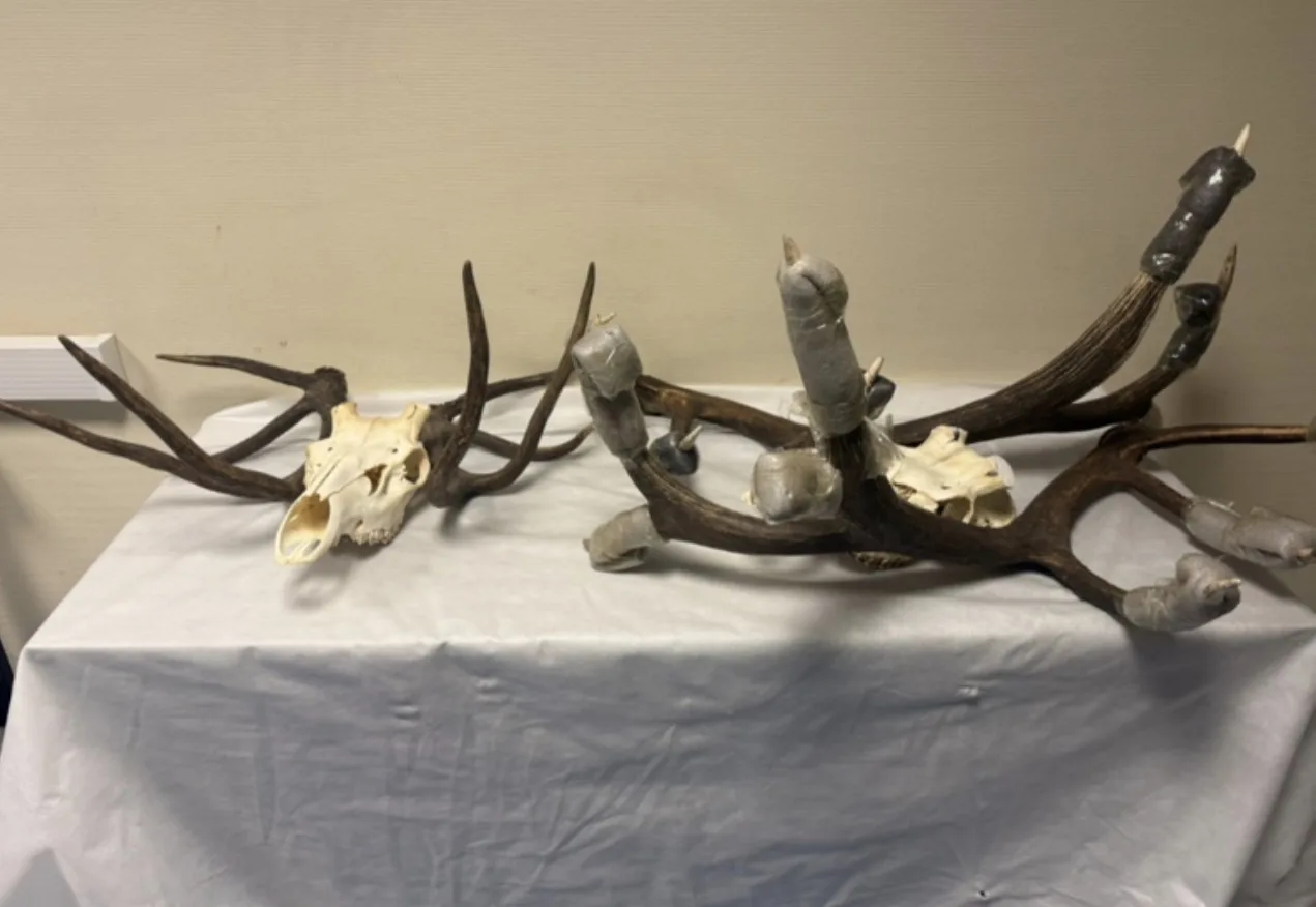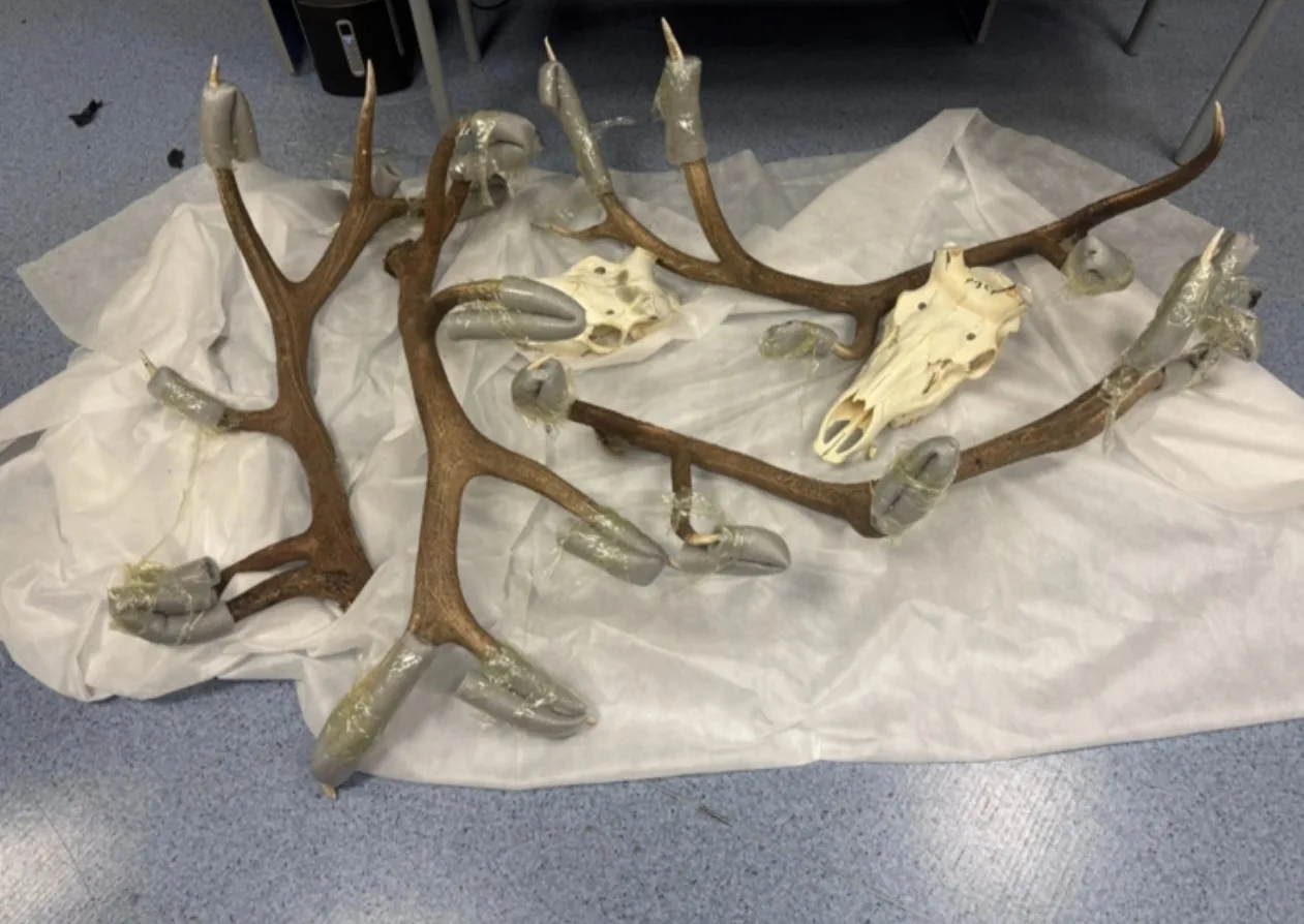 Пассажира остановили на «зеленом» коридоре. В ходе таможенного контроля в его багаже обнаружили обмотанные черной пленкой предметы, похожие на части тел животных. Оказалось, что это рога и черепа оленя в количестве 12 шт.
