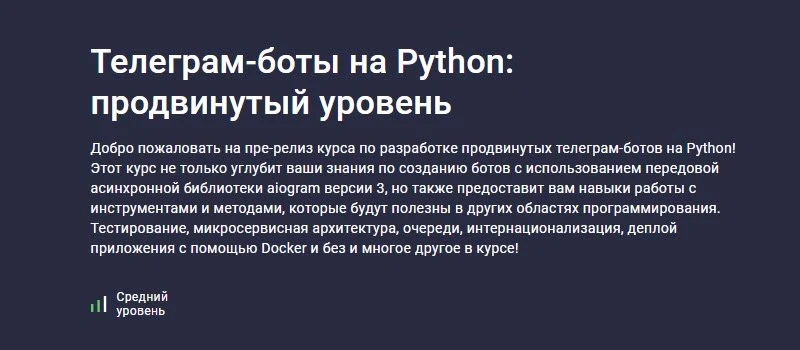 ⏺Курс ориентирован на тех, кто уже имел опыт работы над собственными телеграм-ботами с применением фреймворка aiogram и стремится дополнить свои знания и расширить инструментарий для создания более продвинутых ботов.
