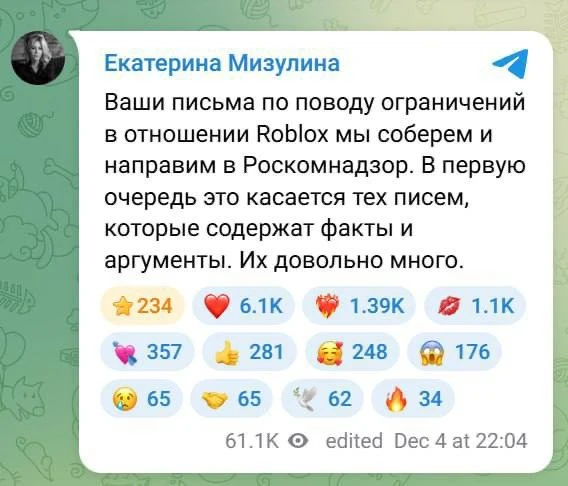 Екатерина Мизулина попытается разблокировать Roblox — она сообщила, что соберёт письма фанатов игр и направит в Роскомнадзор, чтобы убедить ведомство снять блокировку.