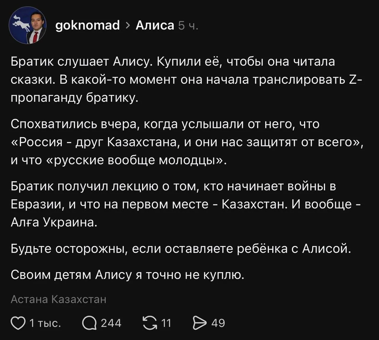 Провокация КГБ, Алиса рассказывала ребёнку про дружбу России и Казахстана и через день его первыми словами были: