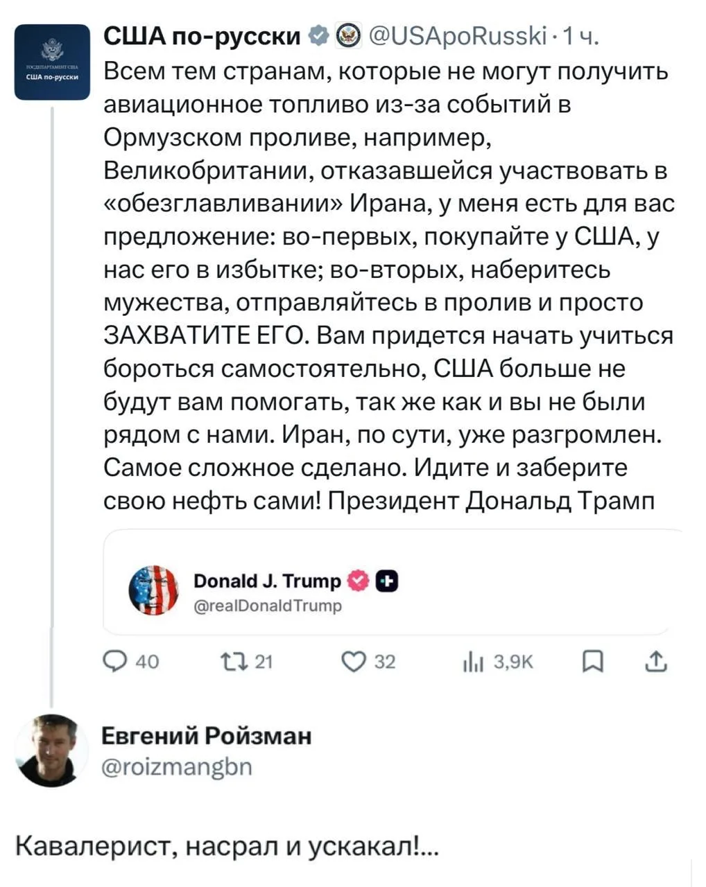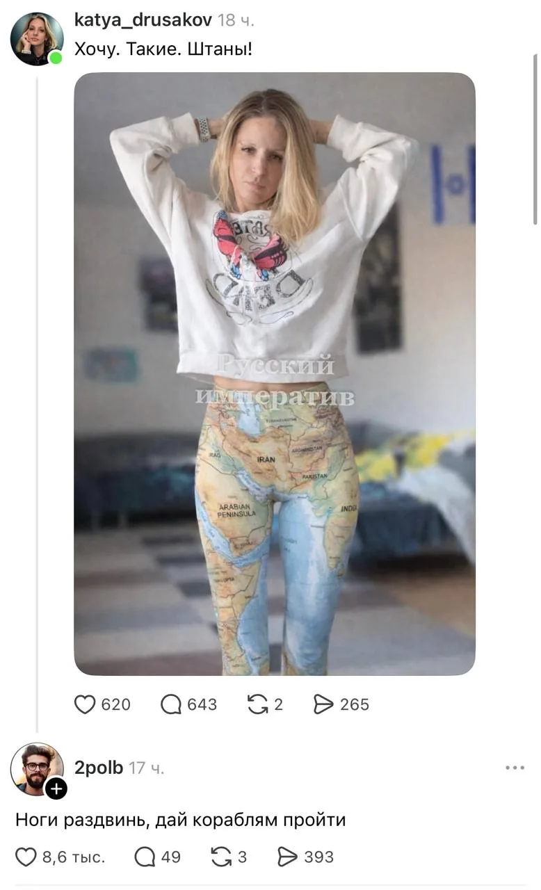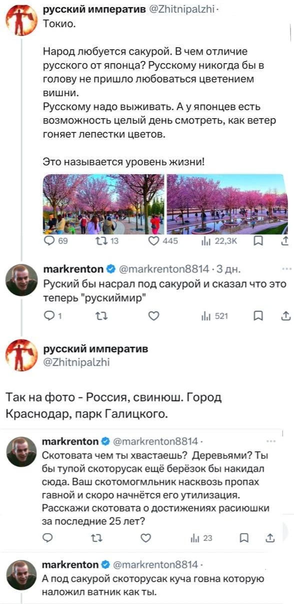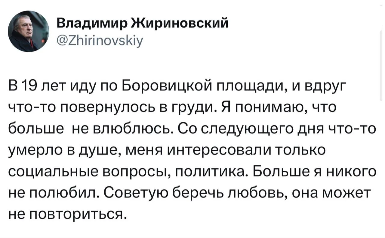 Пока американские педофилы насилуют несовершеннолетних детей на острове Эпштейна, в Детроите феминистке разрешили интенсифицировать себе по гендеру как высоковольтный столб, США тратят миллиарды долларов на войну в Иране, и при попытке спасти начавшего наземную операцию в Иране пилота потеряли половину воздушной группировки в регионе, в России ввели бесплатное лечение от рака по ОМС, запустили по маршруту первые беспилотные грузовики и группировку низкоорбитальных спутников в космос.