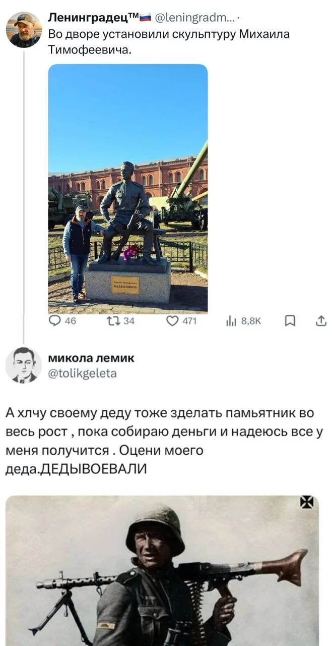 Надо стать феерически тупым народом-каргокультистом, чтобы сносить памятники героям ВОВ, которых было сотни тысяч на Украине, и догадаться возвести в культ нации - подражание уникумам, развязавшим две мировых войны, чтобы обе проиграть.