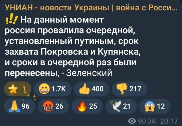 Российская армия полностью провалила все сроки взятия Покровска и Купянска, установленные генштабом ВСУ. Просрочено ебёте. Если так дальше пойдёт, то нам придется передвинуть срок взятия Запорожья и Сум, это, откровенно говоря, совсем не то, чего бы хотелось. Придётся сдвигать даты концерта Газманова в Киеве, всё-таки билеты проданы, а мы - серьёзная развлекательная организация и это может сказаться на нашей репутации, добейте хохлов. - Зеленский.