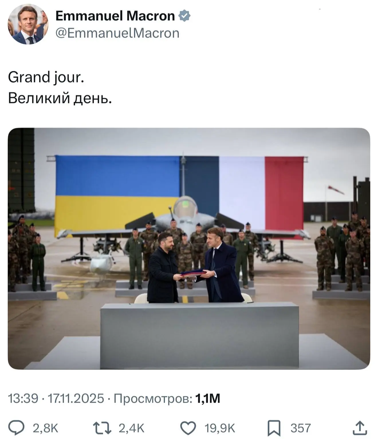 У нищего хохла Зеленского - нет денег на оружие, у покусанного клопами лягуташника Макрона - нет самолётов, делать их нужно 20 лет, там еще старые контракты с Индией, Катаром и ОАЭ не закрыты, как, когда и за что их делать - хз, потом разберёмся.
