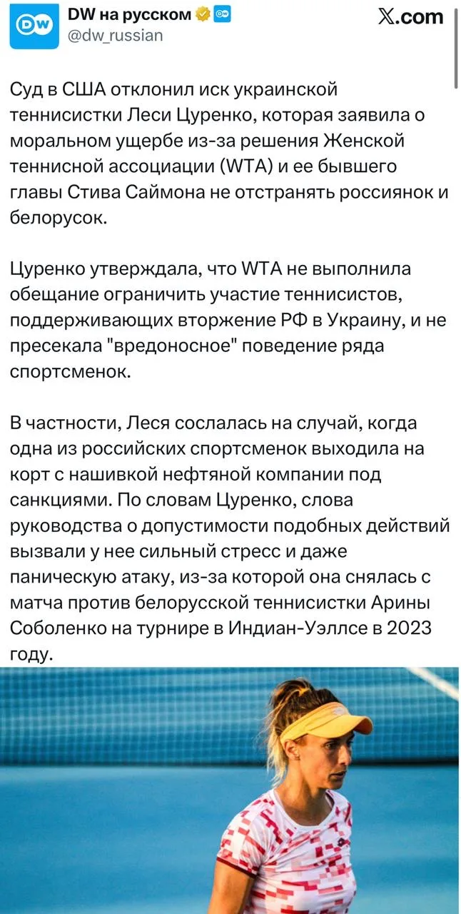 Суд ничего не понял, но на всякий случай постановил, что теннисная ассоциация не обязана заботиться о душевном благополучии украинцев, и отправил её обратно в родное село пасти гусей.