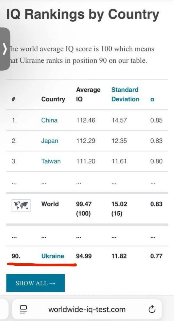 - Официально Украина на 90-м месте по IQ.
