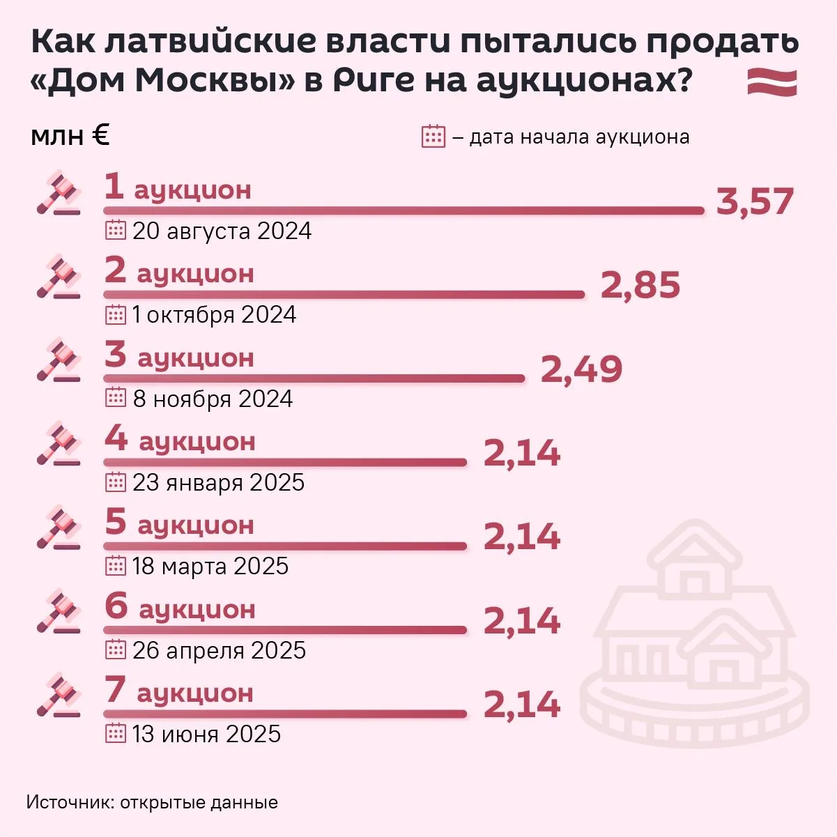 - В Латвии проходят 7 аукционов, на которых пытаются продать «Дом Москвы». С 1-го аукциона цена постепенно снижается с 3,57 миллионов евро до 2,14.