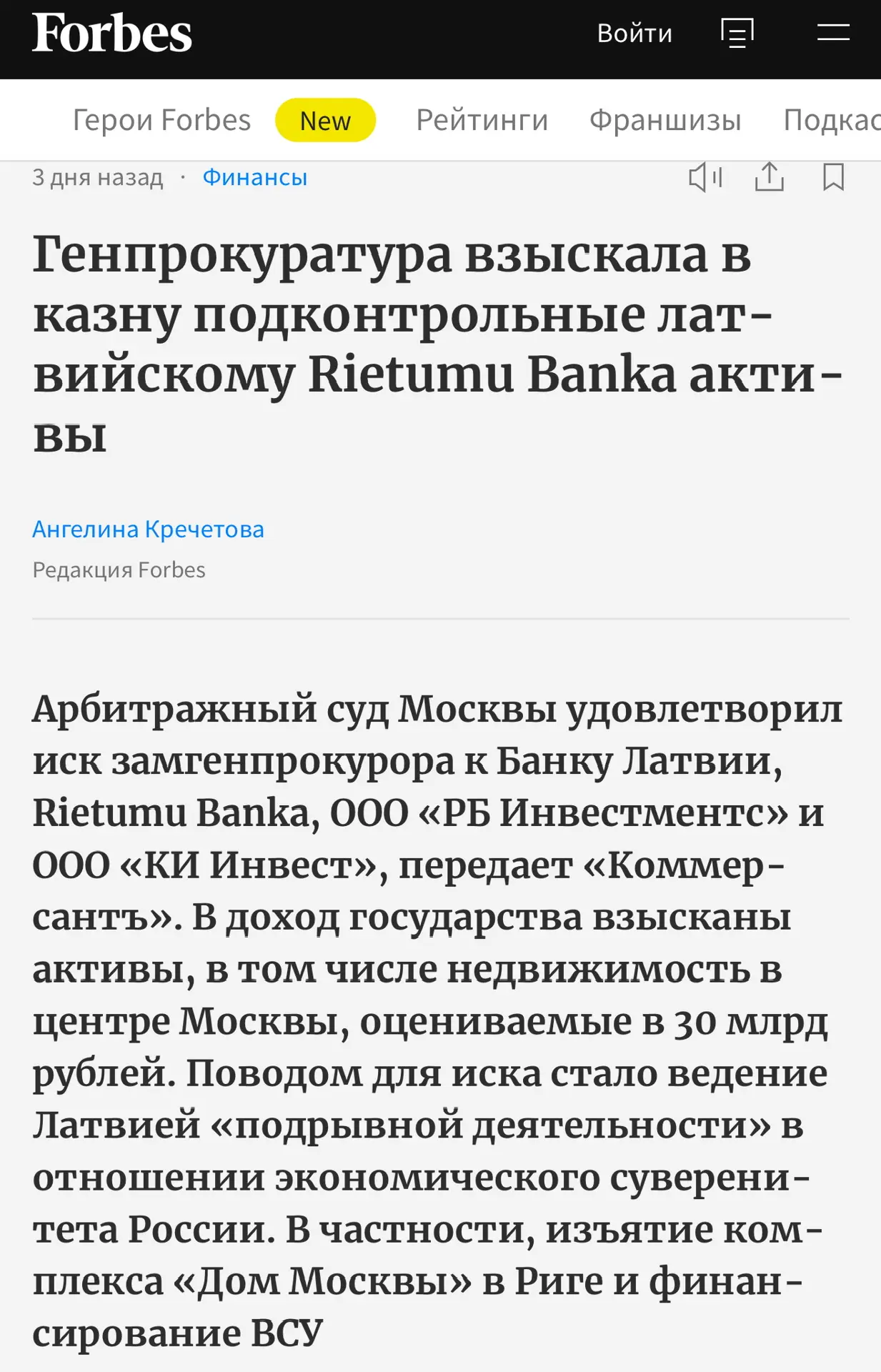 - Арбитражный суд Москвы удовлетворил иск замгенпрокурора к Банку Латвии. В доход Российского государства взысканы активы, в том числе недвижимость в центре Москвы, оцениваемые в 30 млрд рублей.