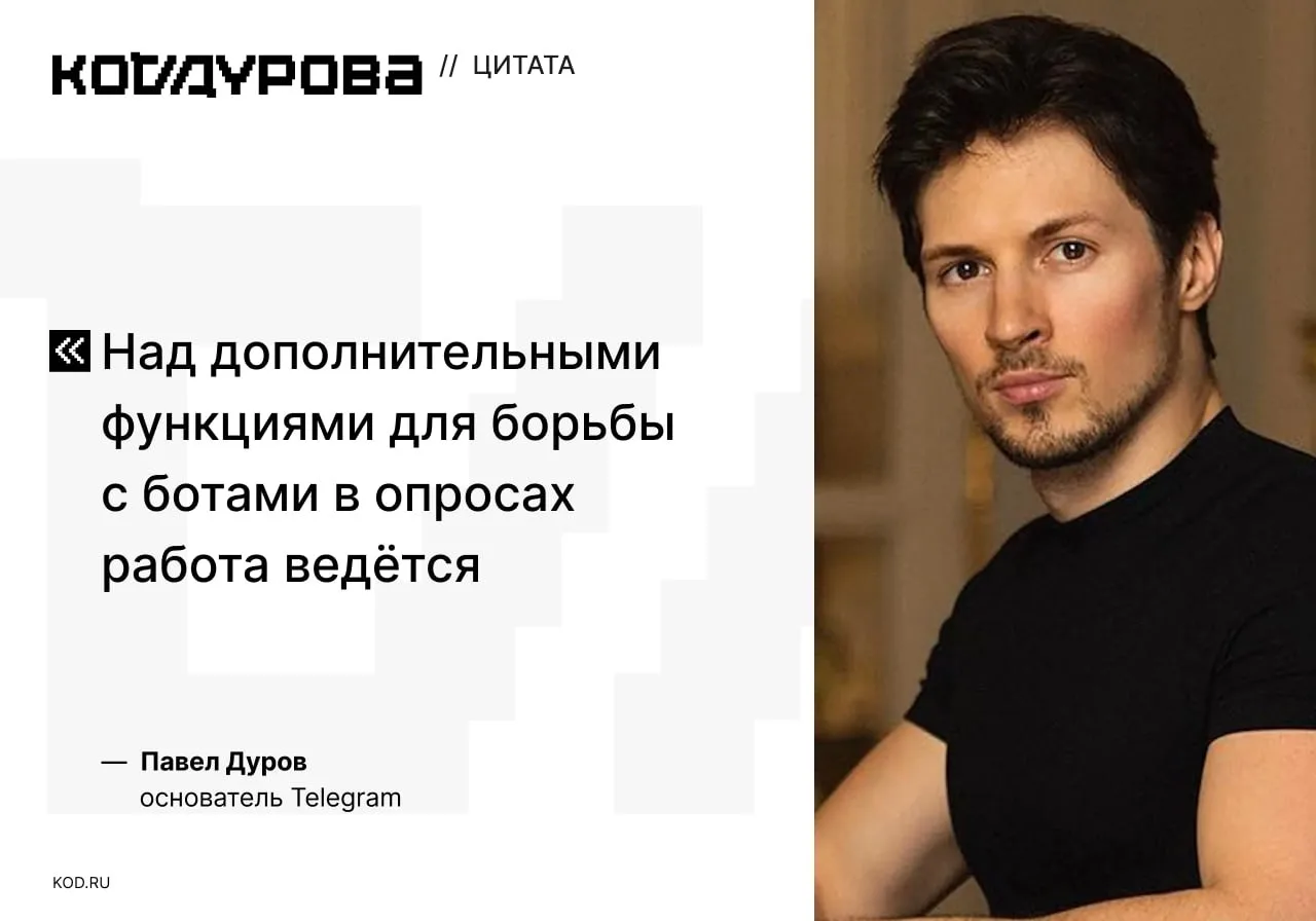 Павел Дуров рассказал, что команда мессенджера ведёт работу над функциями для борьбы с ботами, узнал «Код Дурова» из открытых источников.