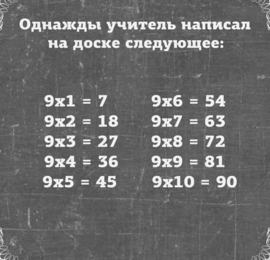 Koгда учитель закончил, он посмотрел на учеников, и все они смеялись над ним из-за первого уравнения, которое было неправильным, а затем учитель сказал: "Я намеренно написал первое уравнение неправильно, потому что я хотел, чтобы вы научились чему-то важному. Это было сделано для того, чтобы вы знали, как мир будет относиться к вам. Вы можете увидеть, что я написал ПРАВИЛЬНО 9 раз, но никто из вас не похвалил меня за это; вы все высмеивали и критиковали меня из-за одной неправильной вещи, которую я сделал. Итак, это и есть урок..."