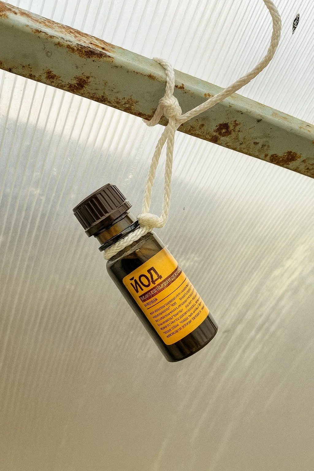 Подвешивание открытой баночки с йодом способствует его испарению, что создаёт благоприятный микроклимат и защищает растения от болезней.
