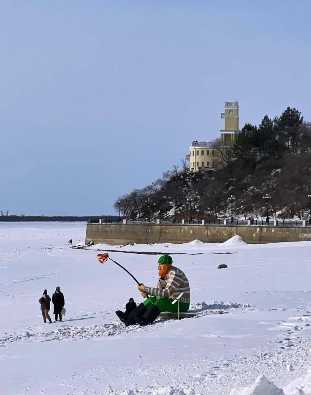 На набережной Хабаровска вновь заметили инсталляцию проекта «Наречие». В этом сезоне на льду - рыбак, который «поймал» на удочку сердце.