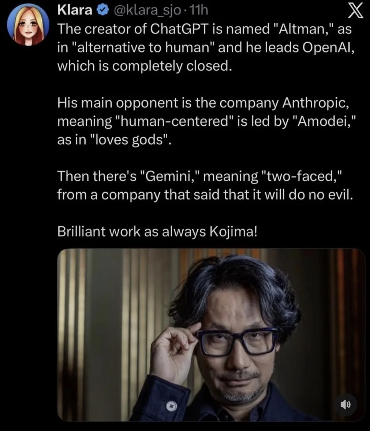 Создателя ChatGPT зовут Альтман (Altman) — как «альтернатива человеку» (alternative to human), и он возглавляет OpenAI («Открытый ИИ»), который на самом деле полностью закрыт.