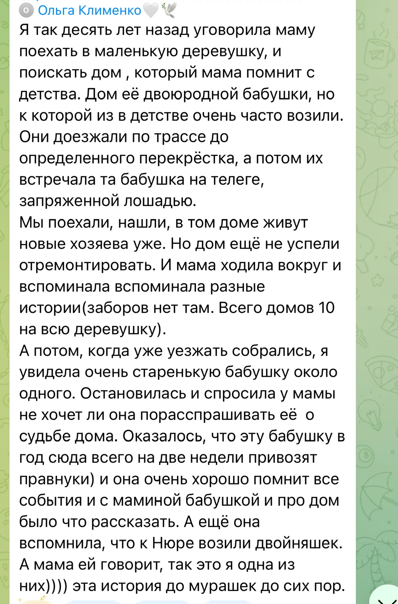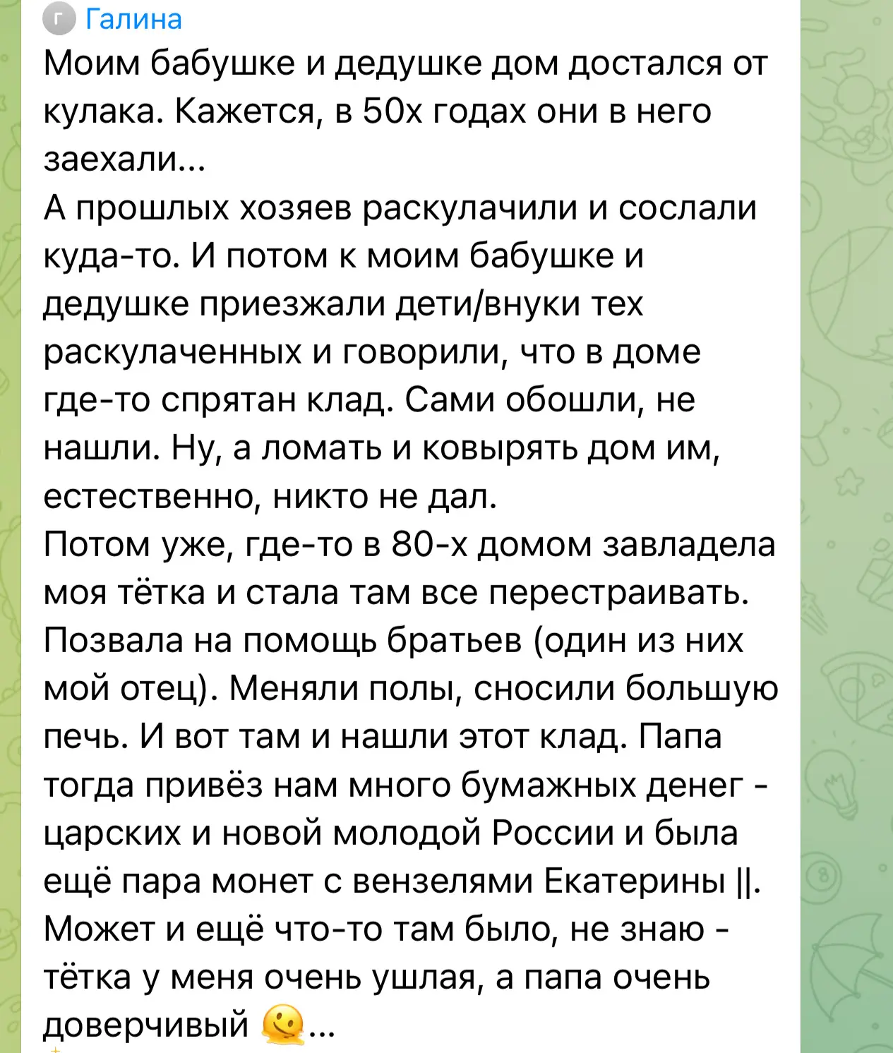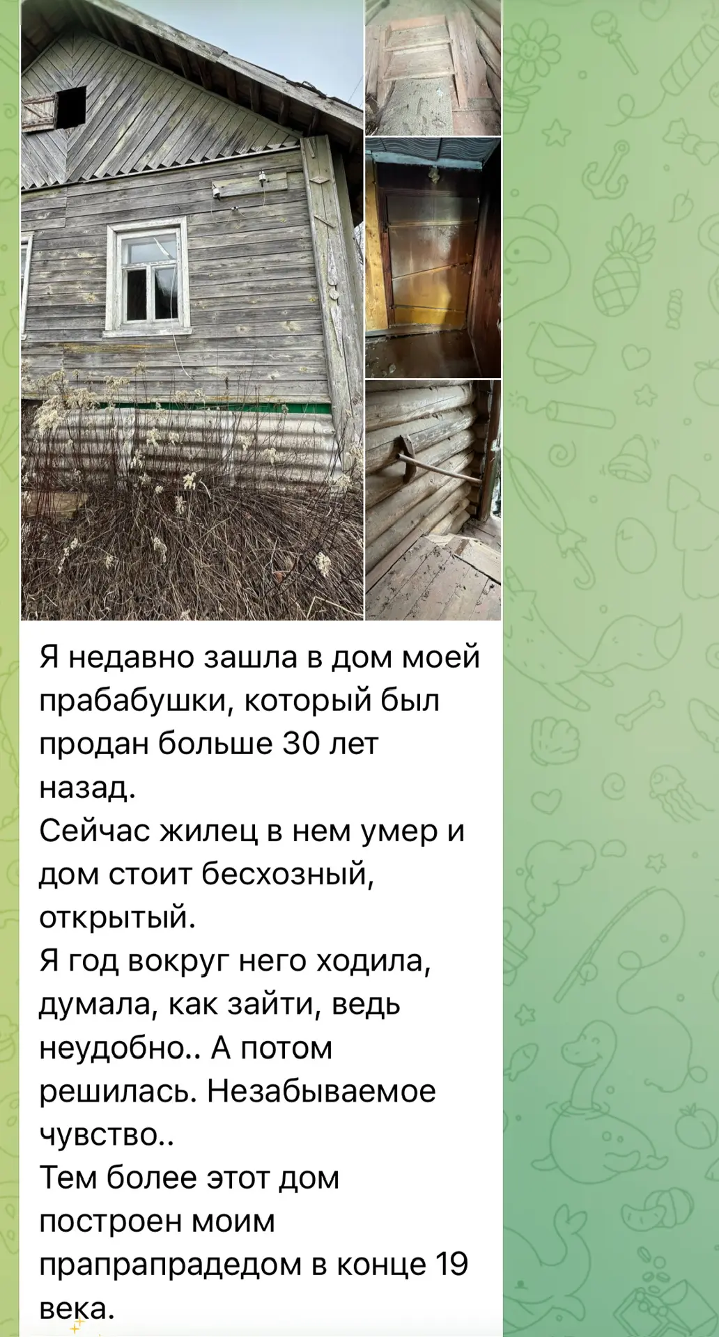 Его после смерти смогли отдать соседи, вроде как завещание прабабушка сделала на них перед смертью. Дом не жалко. Жалко фото, вещи может какие памятные. А ещё прабабушка папе говорила, что у неё есть Николаевские золотые. Мол она их спрятала и потом расскажет куда. Подозрительная была и прижимистая.