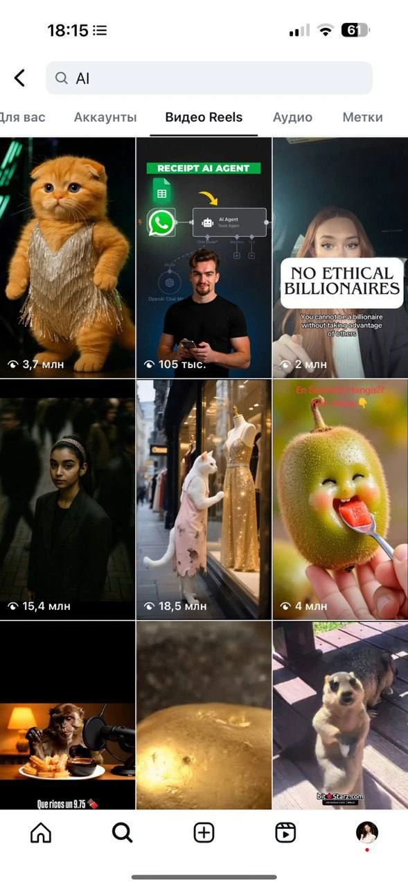Танцующий кот и киви, которое кормят арбузом - самый популярный контенте по запросу «искусственный интеллект» в популярной запрещенной социальной сети. Это лишний раз доказывать, что к ИИ мы пока относимся, как к игрушке. Очень мало людей видят за этим бизнес.