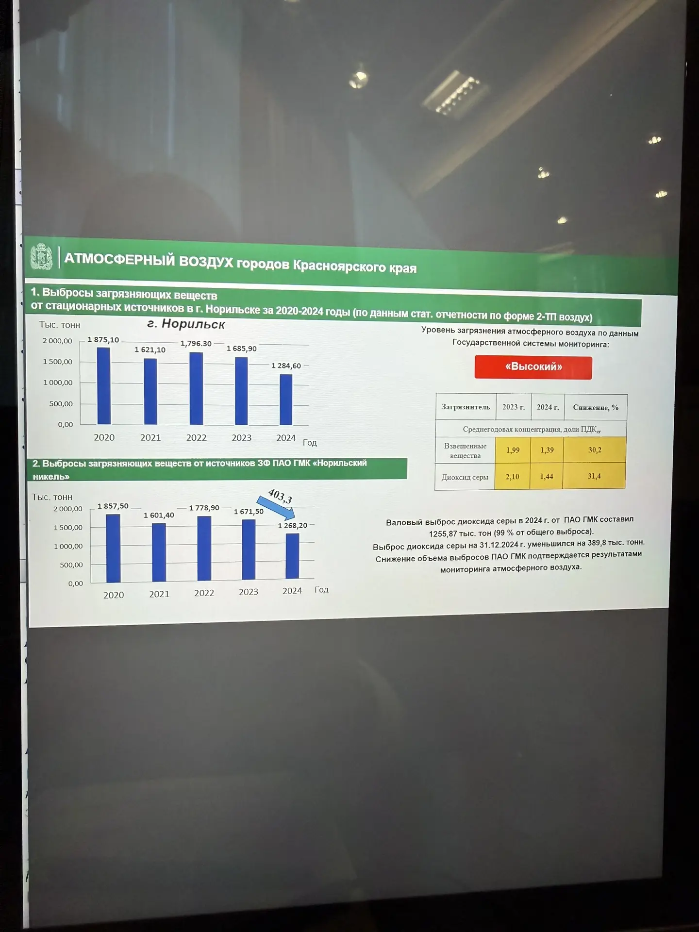 Министр экологии Красноярского края Владимир Часовитин, выступая с традиционным докладом об экологической ситуации в крае сообщил, что моем родном Норильске выбросы диоксида серы от источников «Норникеля» сократились в прошлом году на треть. Уровень загрязнения воздуха характеризуются как «Высокий».