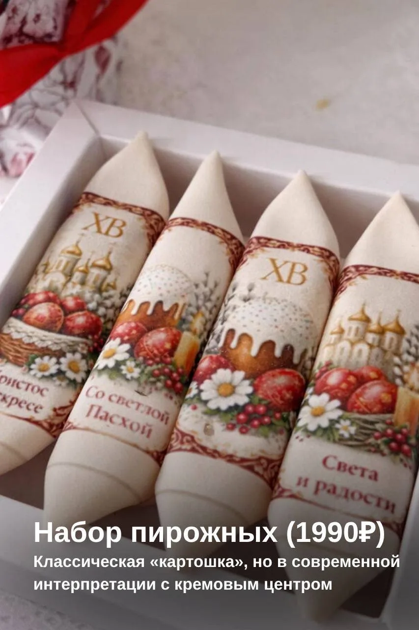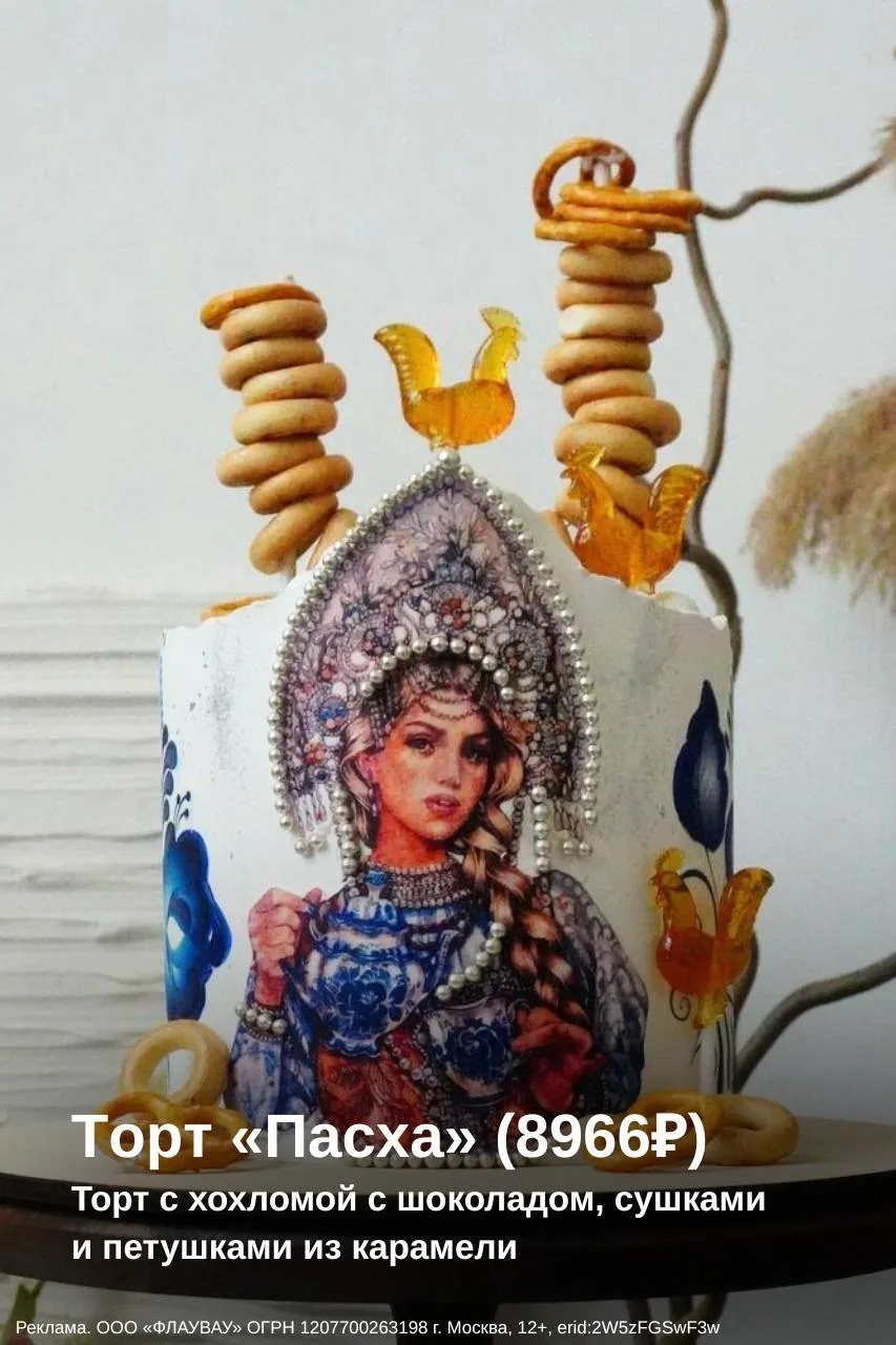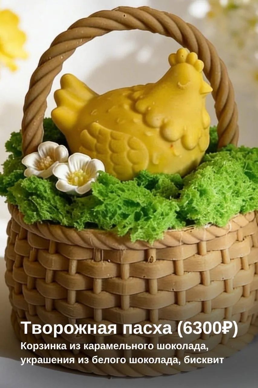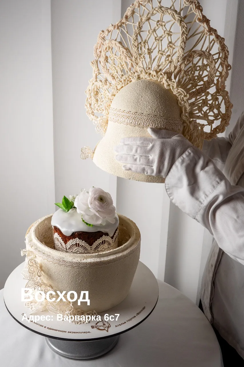 ▪️Матрешка (33.000₽) — корпус матрешки из шоколада, покрыт велюром, украшен кружевами из съедобных нитей. Внутри матрешки кулич с шафраном и белой черешней, украшен весенним букетом из вафельной бумаги, покрыт глазурью, дополнен шоколадными яйцами.