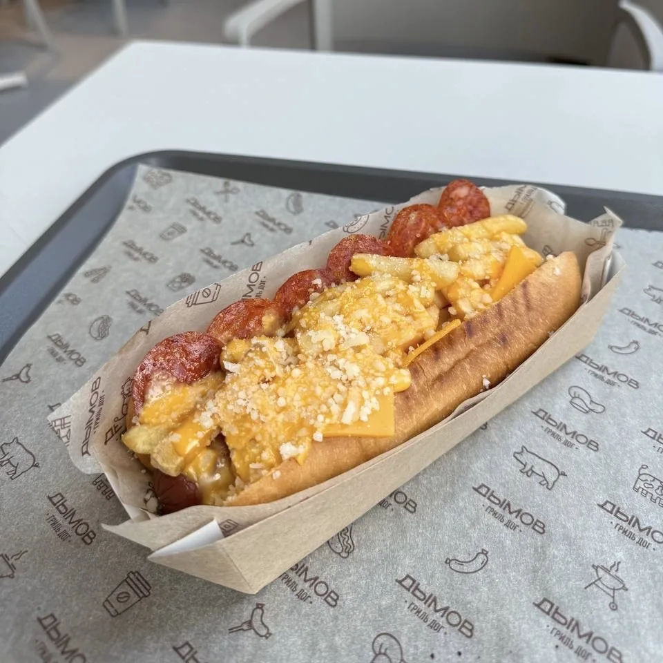 ▪️Сырный (420₽) — колбаска куриная с сыром, сыр чеддер, пармезан, колбаса чоризо, картофель фри, сырный соус. Слишком солено, без напитка не обойтись.