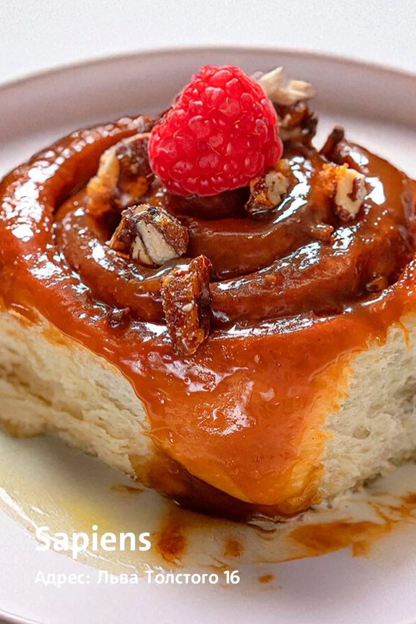 ▪️Sapiens — корица, пекан, начинка из белого шоколада, сливок и маскарпоне, в меню завтраков (920₽).