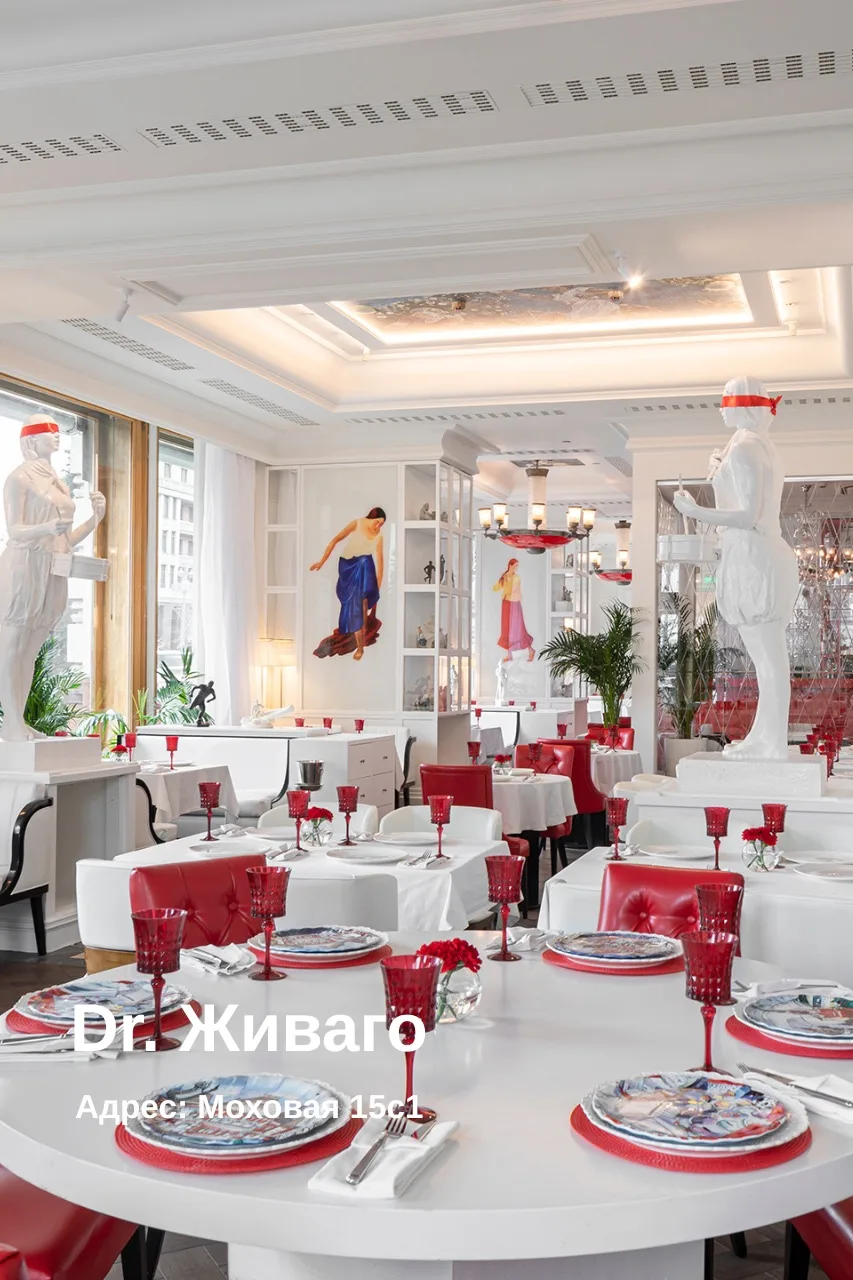 ▪️Dr. Живаго ― ресторан русской кухни Александра Раппопорта с видом на Кремль, на 1 этаже гостиницы «Националь». Внутри белоснежный зал с красными акцентами, мозаика на потолке, чёрные лаковые стены и люстра в форме кремлёвской звезды.