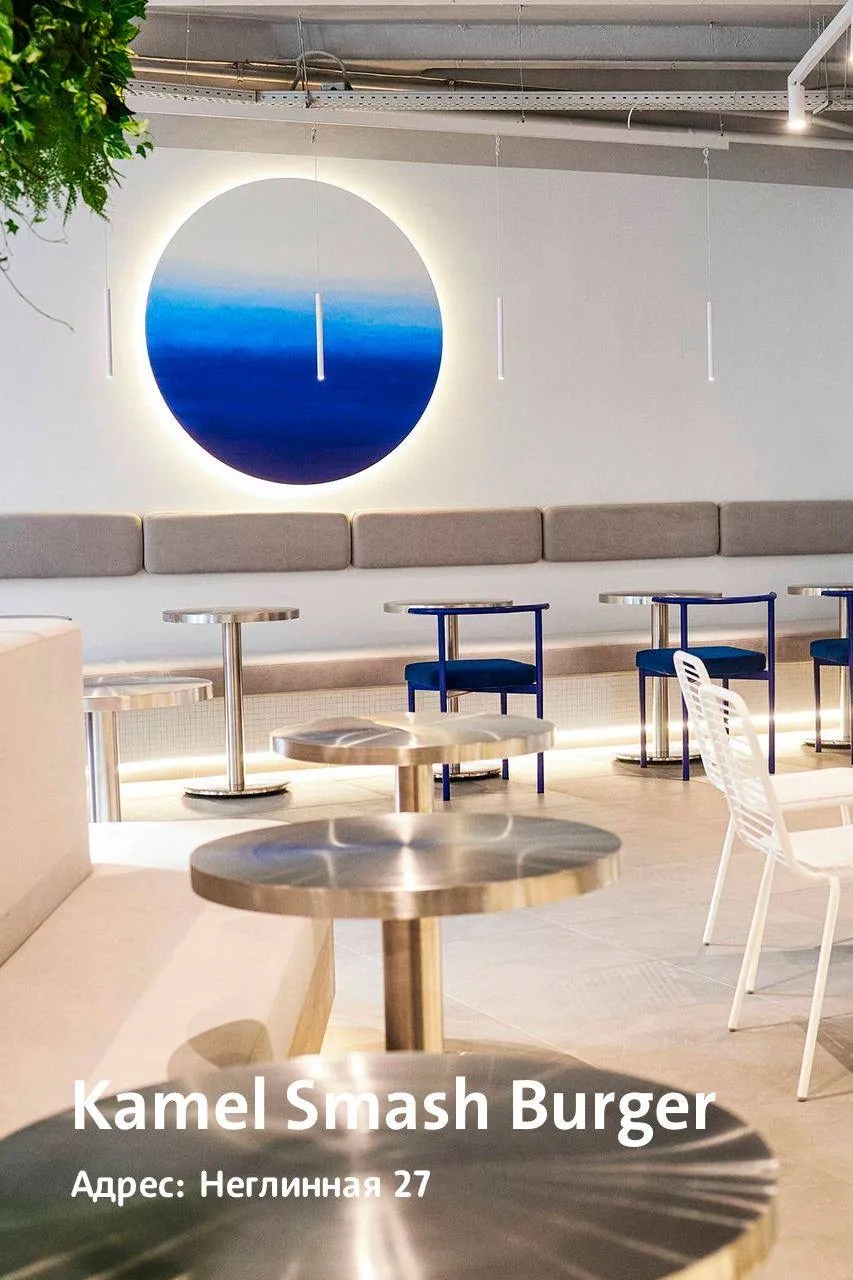 ▪️Kamel Smash Burger — бургерная французского шефа Камеля Бенмамара. Светлый интерьер, в меню — смэш-бургеры, ребра, салаты, картофель фри и фирменное печенье.