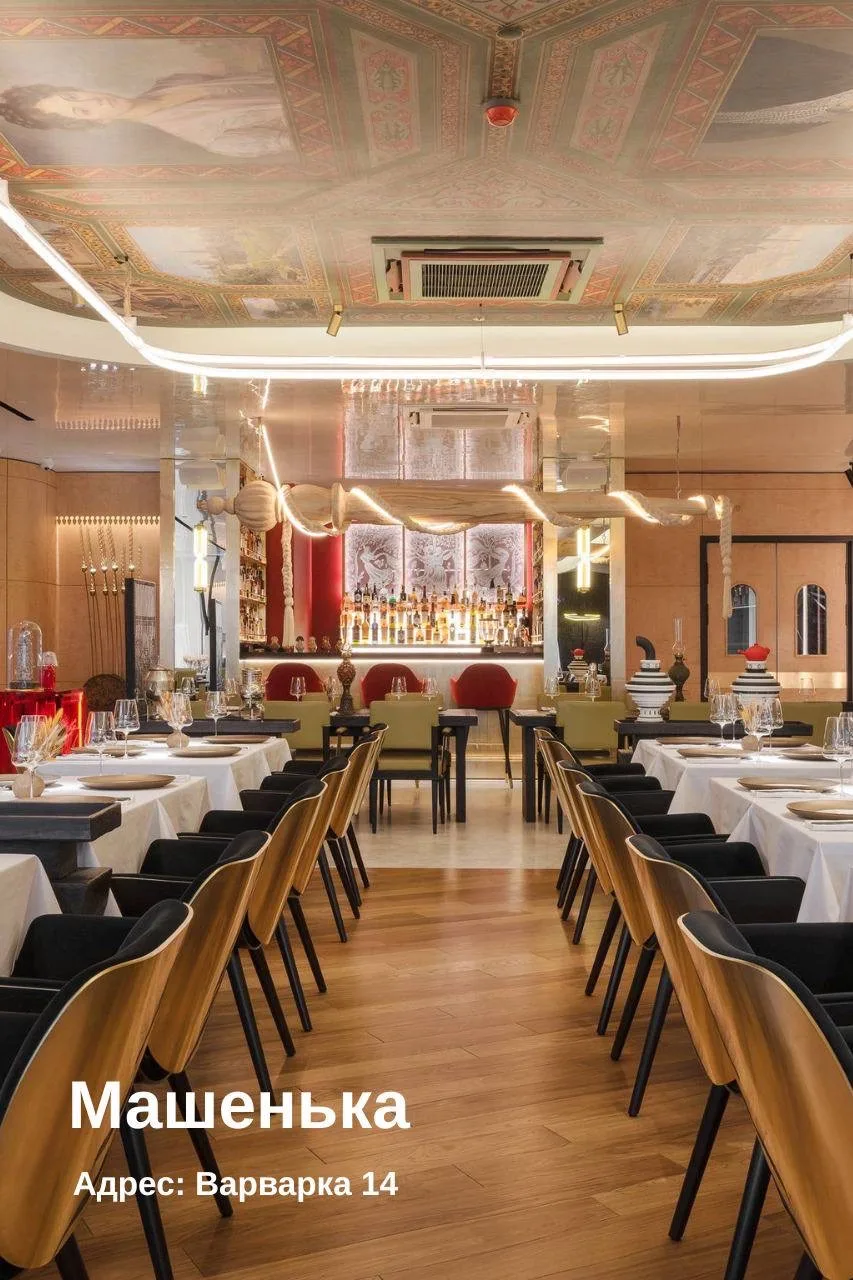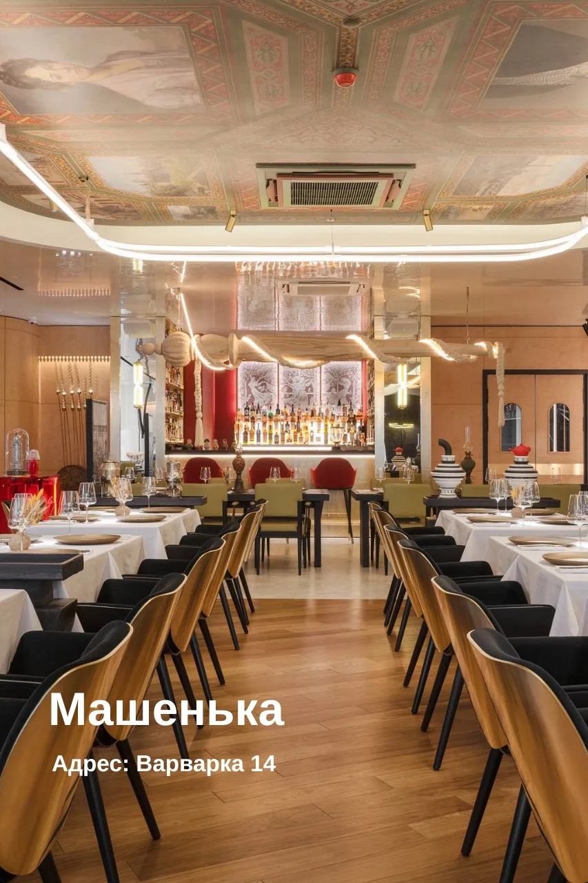 ▪️Машенька — ресторан современной русской кухни Александра Раппопорта. В интерьере отсылки к народным промыслам, самовары, расписной потолок и портреты «Машенек» из разных эпох. В меню авторская интерпретация классики.